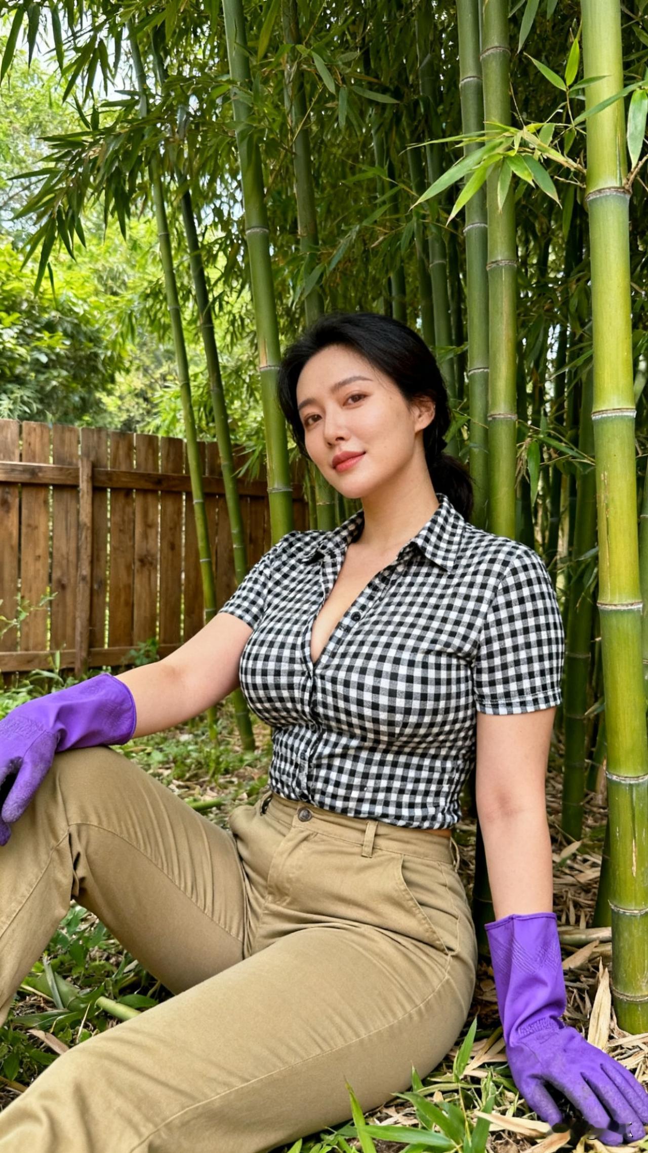 黑白格纹衫配卡其裤,紫色手套一戴,她在竹林间侍弄草木的模样,把园艺活成了时尚大片