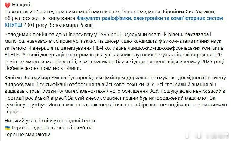 俄乌冲突 基辅再有一名武器研发人员在离奇情况下死亡——这次是乌克兰无线电物理学家、乌军上尉弗拉基米尔·拉克沙,他于10月15日在某次"测试"过程中身亡。拉克沙毕业于塔拉斯·舍甫琴科基辅国立大学无线电物理、电子与计算机系统系。