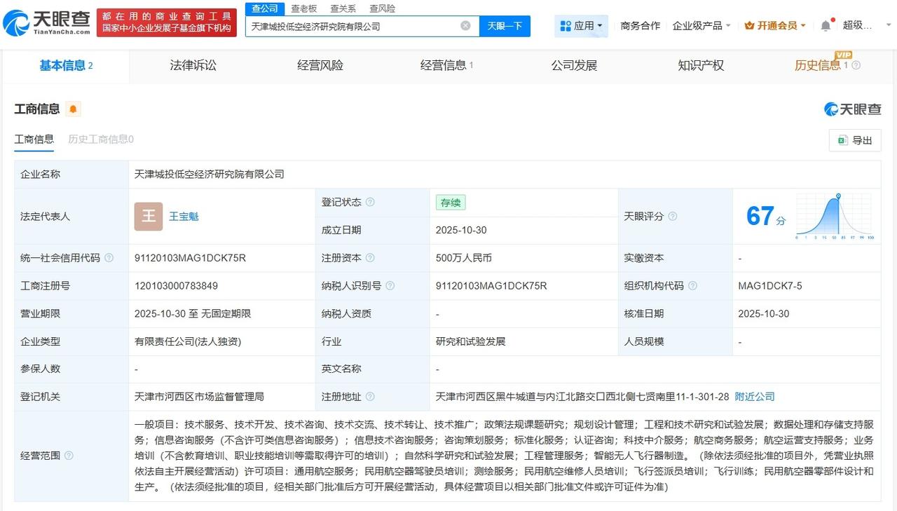 天津城投成立低空经济研究院公司注册资本500万 天眼查App显示,近日,天津城投低空经济研究院有限公司成立,法定代表人为王宝魁,注册资本500万人民币,经营范围包括工程和技术研究和试验发展、自然科学研究和试验发展、智能无人飞行器制造等。股权全景穿透图显示,该公司由天津低空经济投资发展有限公司全资持股,后者为天津城市基础设施建设投资集团有限公司全资子公司。 天眼查信息: