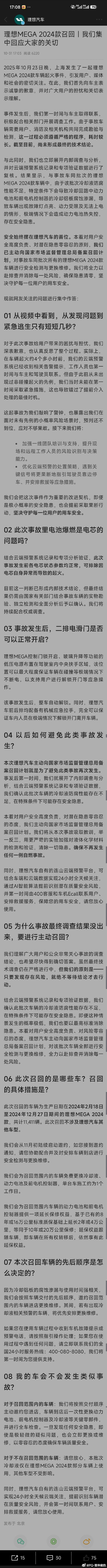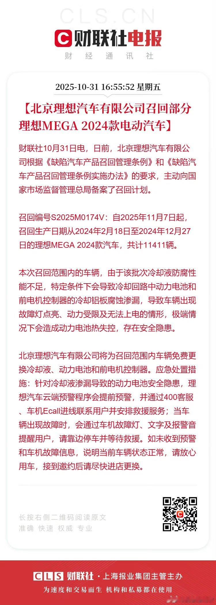官方措施描述:对事故车同批次所有的理想MEGA 2024款车辆进行安全检测与更换维修。