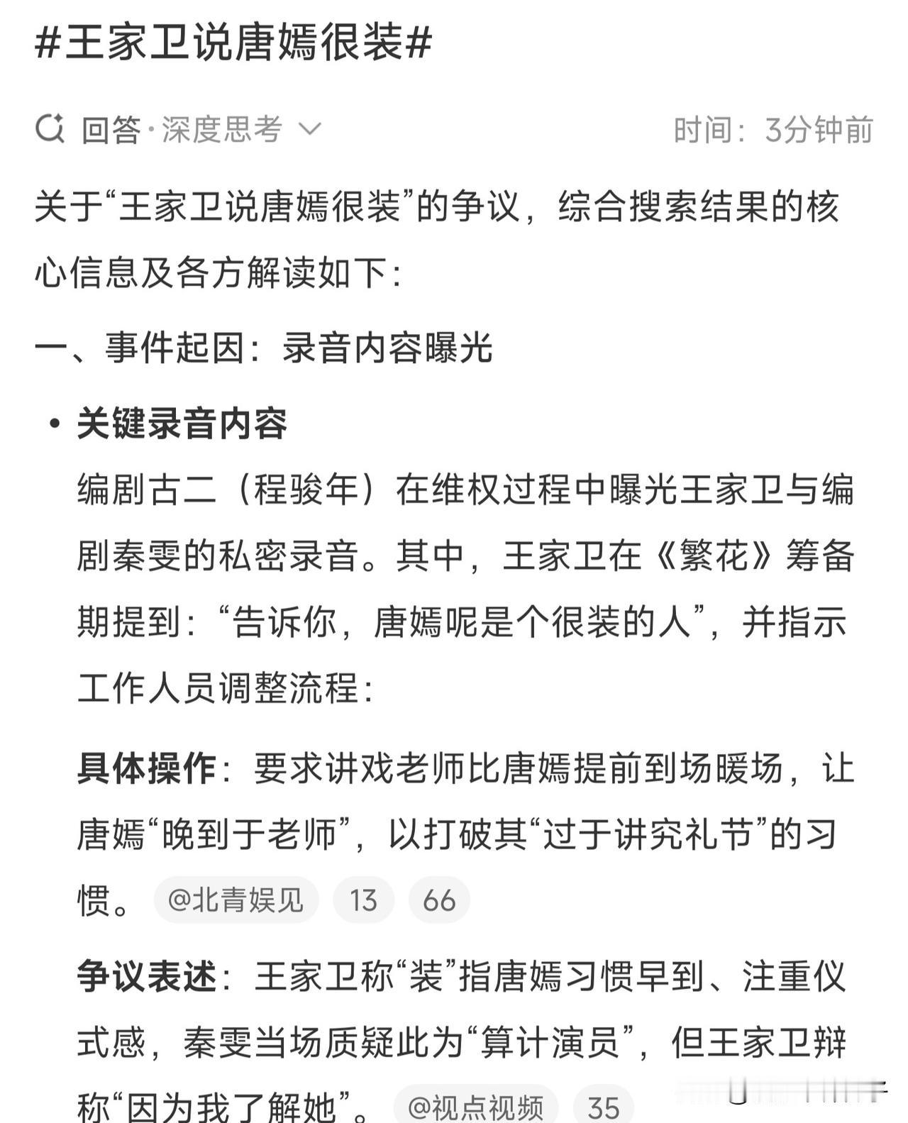 编剧古二曝出这段私密录音,可把导演王家卫给坑惨了! 10月31日,关于王家卫的多个词条冲上热搜,起因是古二曝光王家卫与编剧秦雯的私密录音,内容牵扯到很多演员。 咱就说,这热搜词条,不看不知道,一看吓一跳,又是唐嫣,又是金靖,还有游本昌老爷子。 光从字面来看,王家卫对这几个演员,说的都不是好话,这……,真的是一下子得罪了好多人。 特别是唐嫣,知名度和人气摆在那里,粉丝有点坐不住了。 当然,录音内容是真是假?不得而知,就算是真的,不同的语境,意思可能不一样。 咱就说,这个编剧古二有点不太地道了,有问题可以通过正确途径解决,直接曝光私密录音,就算不考虑王导,起码也要顾及几位演员的感受。 还是那句话,网上爆料未必可信,希望大家理性吃瓜,还是等待当事人的回应吧。