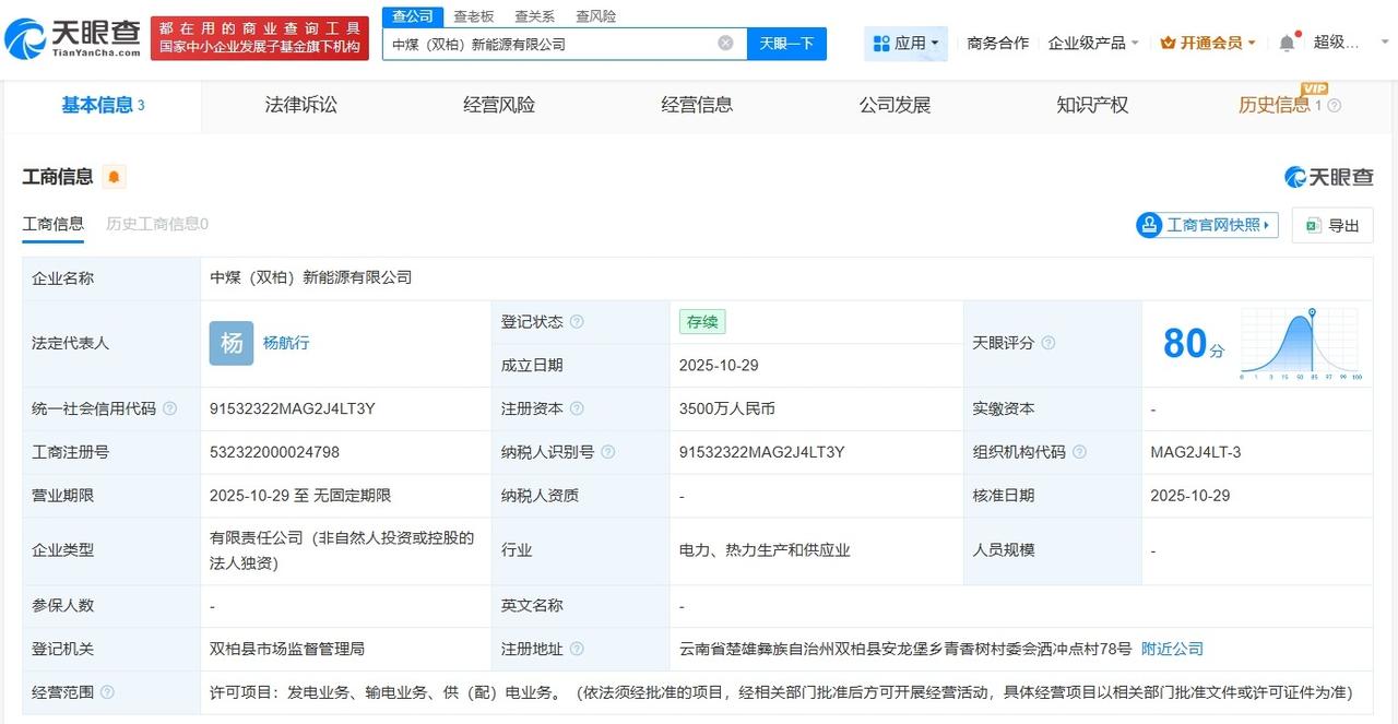 中国中煤在云南双柏成立新能源公司注册资本3500万 天眼查App显示,近日,中煤(双柏)新能源有限公司成立,法定代表人为杨航行,注册资本3500万人民币,经营范围为发电业务、输电业务、供(配)电业务,由中国中煤旗下中煤绿能科技(北京)有限公司全资持股。 天眼查信息: