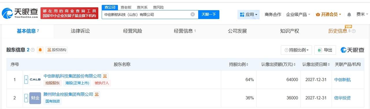 中创新航等在山东成立科技公司注册资本10亿 天眼查App显示,近日,中创新航科技(山东)有限公司成立,法定代表人为王小强,注册资本10亿人民币,经营范围包括电池制造、电池销售、新能源汽车废旧动力蓄电池回收及梯次利用等,由中创新航(03931.HK)、滕州财金控股集团有限公司共同持股。 天眼查信息: