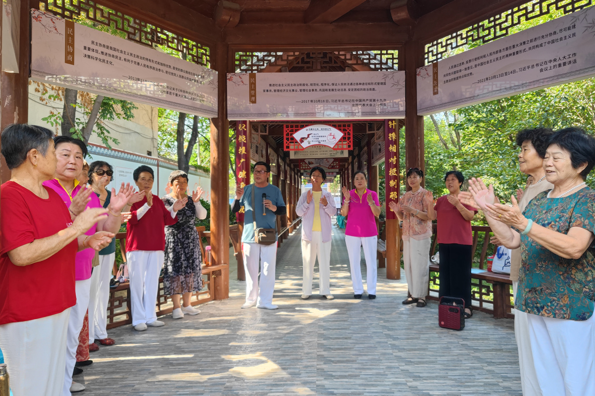 居民在襄城县城关镇北关社区长廊里合唱红歌