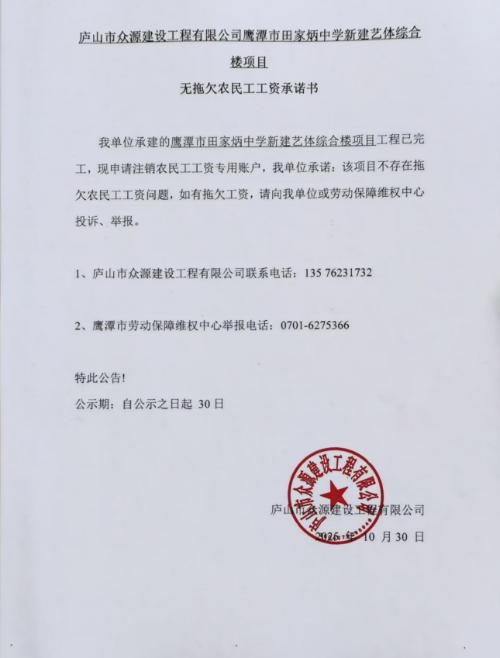 我单位承建的鹰潭市田家炳中学新建艺体综合楼项目工程已完工,现申请注销农民工工资专用账户,我单位承诺:该项目不存在拖欠农民工工资问题,如有拖欠工资,请向我单位或劳动保障维权中心投诉、举报。
