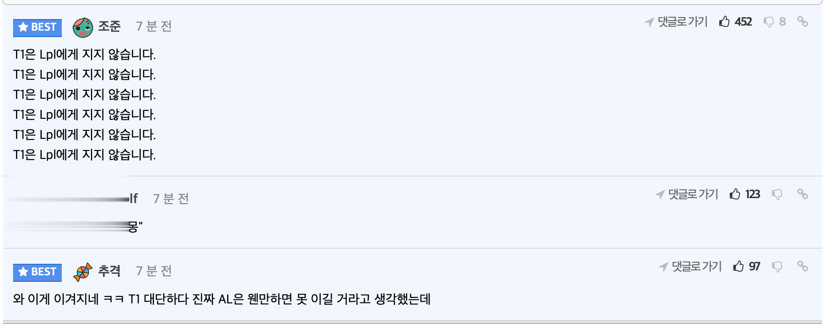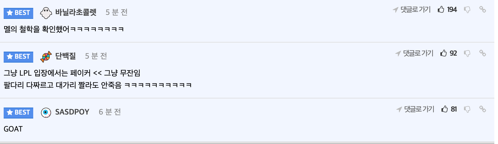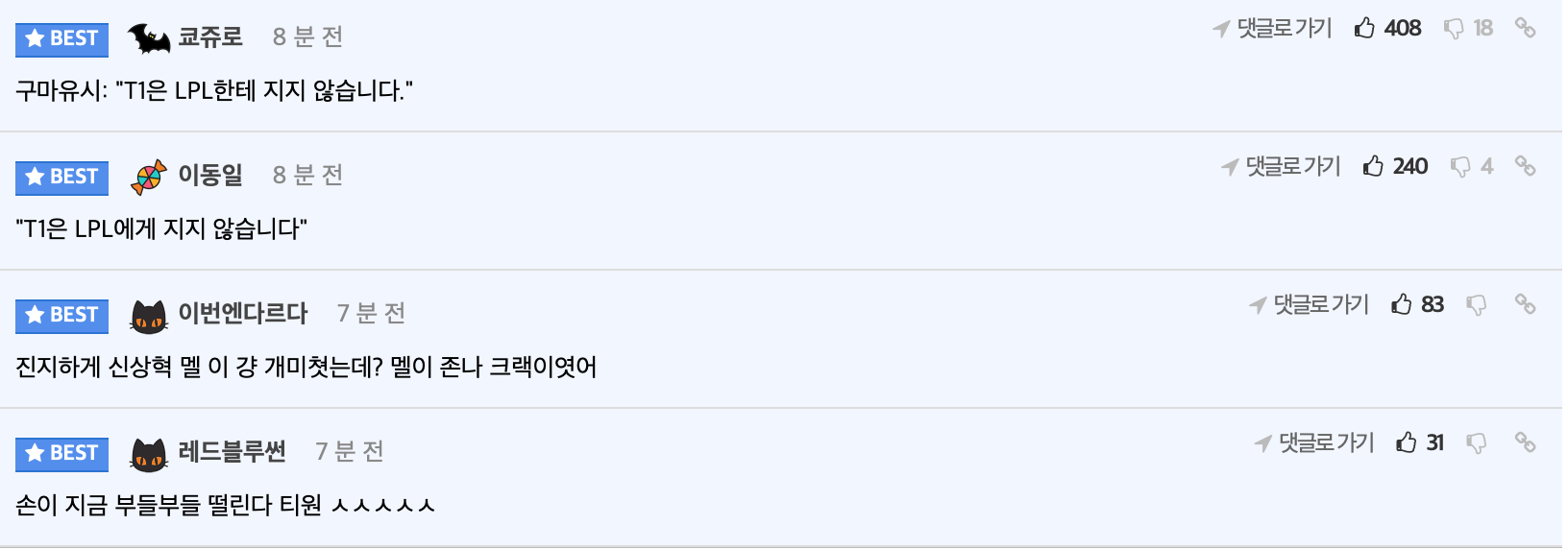 虎扑10月31日讯2025英雄联盟全球总决赛八强第四场比赛T1以3比2战胜AL晋级四强,赛后韩国论坛网友对此展开热议,部分热门评论翻译如下: