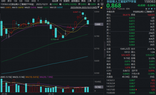 周五(10月31日),以光模块为核心的算力硬件继续回调,三巨头继续大跌,光模块含量超51%的创业板人工智能一度跌超3%。其中,天孚通信、中际旭创领跌超8%,新易盛、联特科技、光库科技、长芯博创等多股跌超5%。上涨方面,AI应用表现活跃,深信服领涨超13%,蓝色光标、中文在线、易点天下等多股跌超5%。