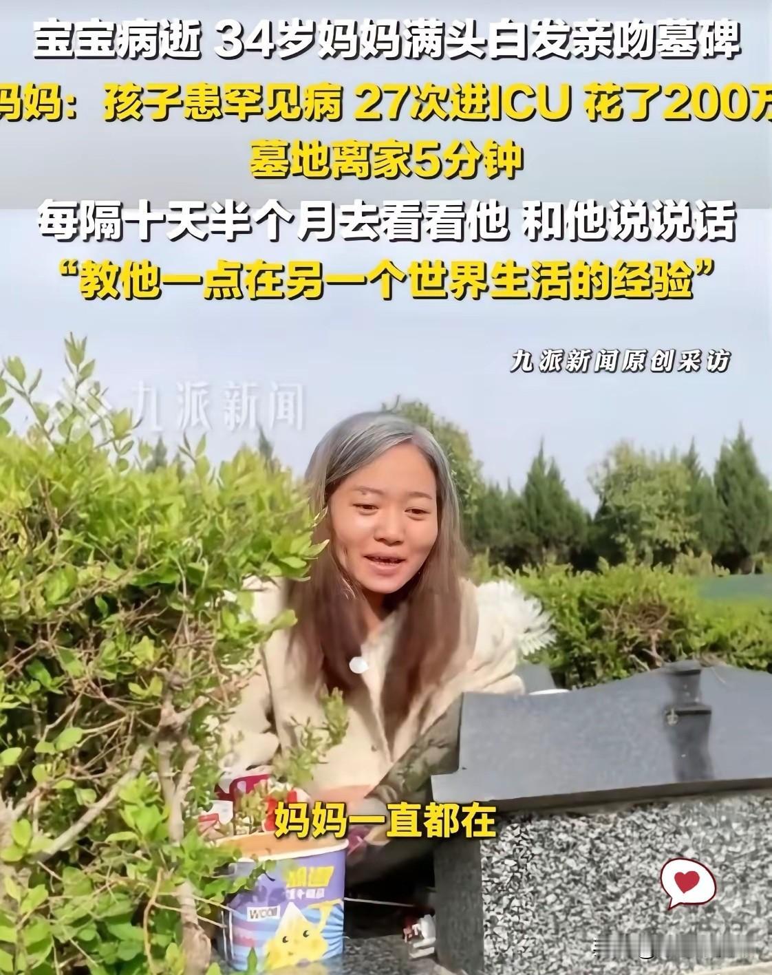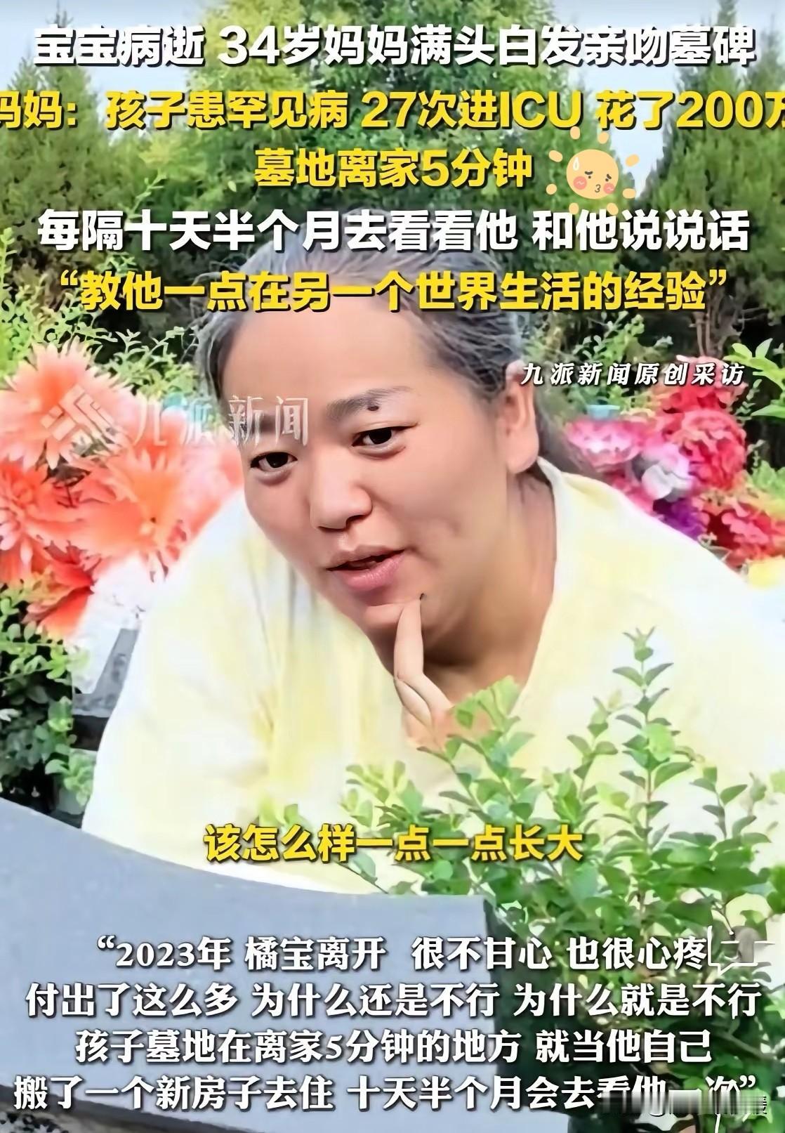 看到那位妈妈的白发贴在墓碑前,我心里咯噔一下😢。她才34岁啊,头发怎么就全白了? “宝宝,妈妈再亲一口哦。”这句温柔的话,藏着多少夜晚的思念。她的橘宝才3岁,因为罕见病已经离开两年了。 这3年,她是怎么熬过来的?孩子27次被送进ICU,她一次次签病危通知书,头发在那段时间全白了💔。为了救孩子,她辞了工作,花了近200万,跑遍了全国各地医院。 如今,孩子的墓地选在离家只有5分钟的地方。她说:“就当他自己搬了一个新房子去住。”每隔十几天,她就来陪孩子说说话,摆上橘宝爱吃的草莓,聊聊家常... 她说要教儿子“在另一个世界生活的经验”。这句话让我瞬间泪崩😭,这就是妈妈啊,即使生死相隔,依然放心不下她的孩子。 这场母爱,从来没人教她什么时候该结束。现在,她把对橘宝的爱化作了力量,去帮助其他罕见病家庭。 这份爱,从未离开,只是换了一种方式继续陪伴🌸。如果天堂有回音,一定能听见那句:“橘宝,妈妈一直都在。”🙏❤️ --- 消息来源:羊城晚报、杭州网、腾讯新闻