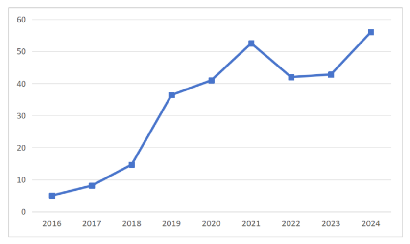 中国绿色债券市场在波动中高速增长。从发行规模来看,2016—2024年,中国绿色债券发行规模从2018亿元增长至6833亿元,年均增长16.5%;市场存续规模从2039亿元增长至21621亿元,年均增长34.3%;绿色债券发行机构数量从35家增长至249家,年均增长27.8%。