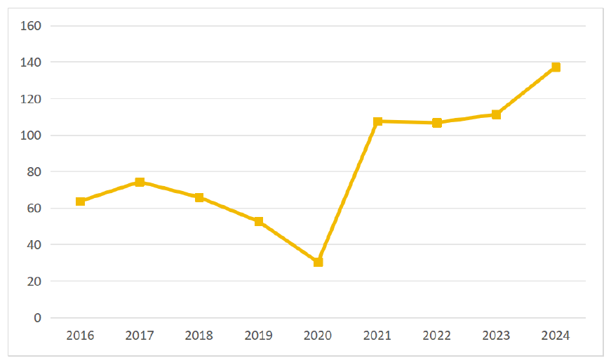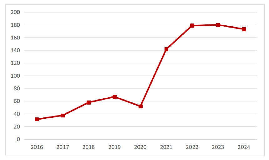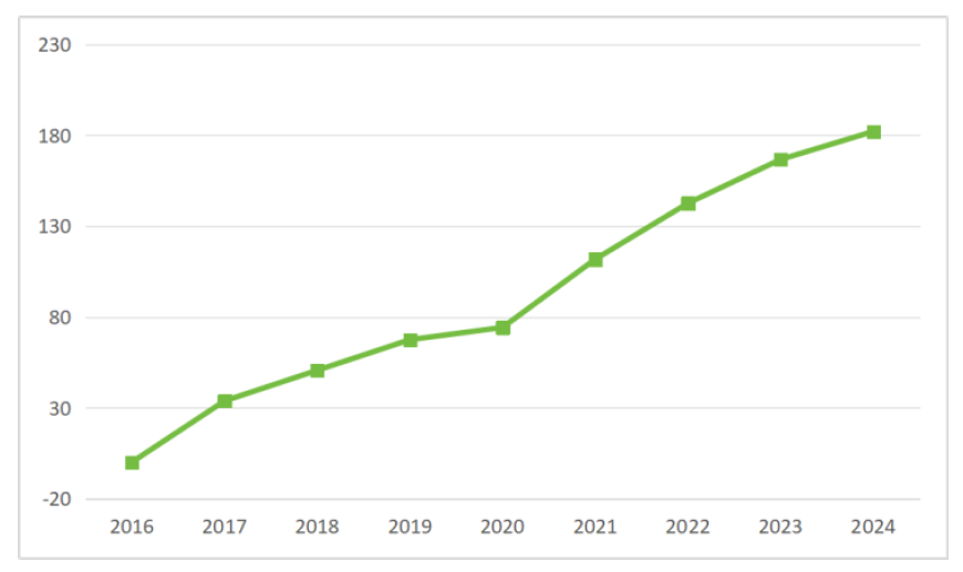 基于绿色债券市场评价指标体系,中央结算公司通过对数据标准化后加权求和得到指数序列,构建了中国绿色债券市场发展质量指数。结合中国绿色债券市场的发展历程,按年对2016至2024年数据进行对应分析。结合中国绿色债券市场发展实践及各项指标的重要程度,对18项指标赋予差异化权重,其中政策支持占比30%,市场运行占比35%,信息披露占比25%,国际合作占比10%。