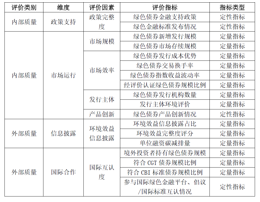 绿色债券市场发展质量分为内部质量和外部质量两大维度。内部质量主要聚焦市场内在发展动力,包含了支持政策、市场规模、发行机构数量等要素;外部质量主要聚焦市场外部辐射影响,包含量化环境效益、国际影响力等要素。基于内外部质量的视角,从政策支持、市场运行、环境效益及国际合作四大维度,研究构建绿色债券市场发展评价指标。共设置18个评价指标,包括4个定性指标、14个定量指标,从定性、定量双重维度反映绿色债券市场发展质量。