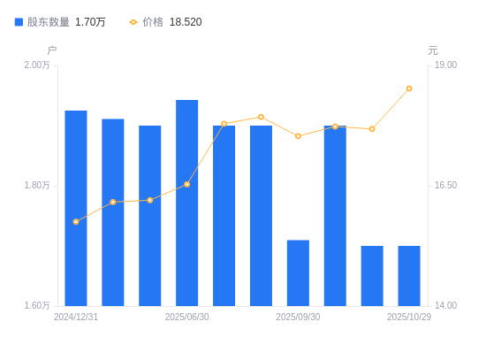 日期A股户数(户)流通A股户均持股数(股)户均持股市值(万元)2025-10-20170006589.1211.652025-10-10190005895.5310.452025-09-30170946552.8911.492025-09-10190005895.5310.572025-08-31190005895.5310.492025-06-30194285765.659.532025-06-10190005895.539.552025-03-31191115861.299.472024-12-31192515818.669.172024-12-20196005715.059.68