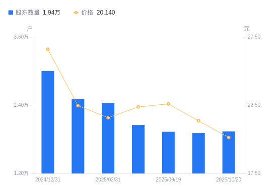 日期A股户数(户)流通A股户均持股数(股)户均持股市值(万元)2025-10-201938510979.2922.112025-09-301915811109.3823.732025-09-191933611007.1124.882025-06-302055310355.3523.182025-03-31243748731.9918.852025-02-28250748488.2119.082024-12-31300127091.6118.872024-09-30279797606.9016.332024-06-302120710036.0016.152024-03-31237198973.1218.08