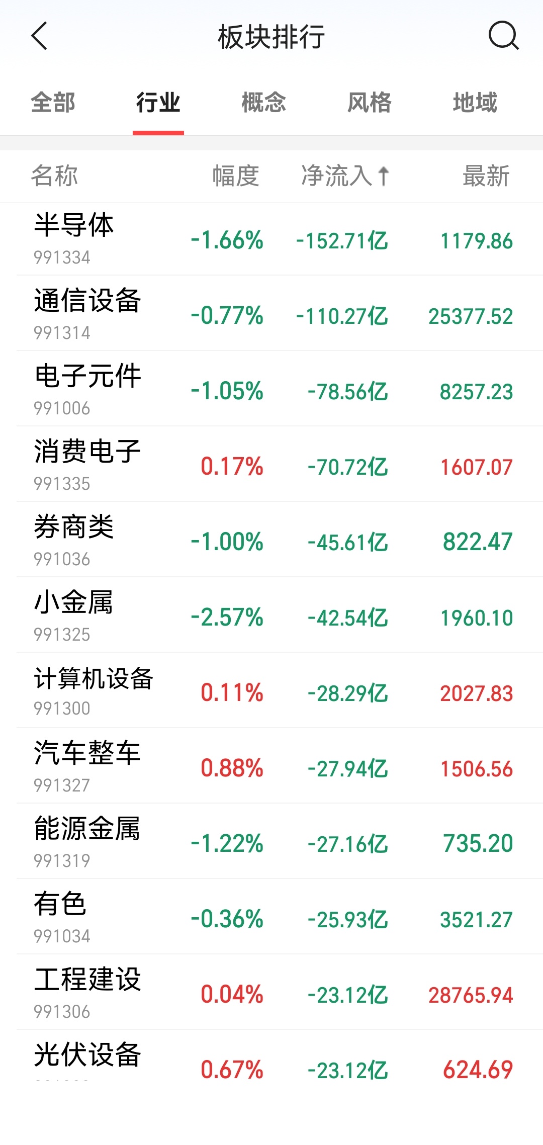 今天资金流入最多的是文化传媒板块。资金流出最多的是半导体板块。基本就是一个高低切