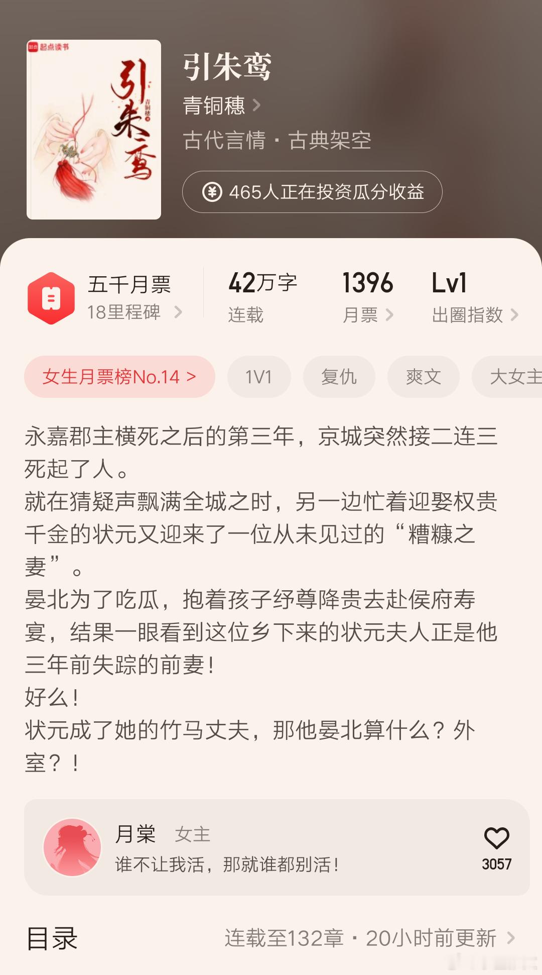 女主重生,宅斗权谋,写过《覆手繁华》、《娘子万安》、《喜遇良辰》