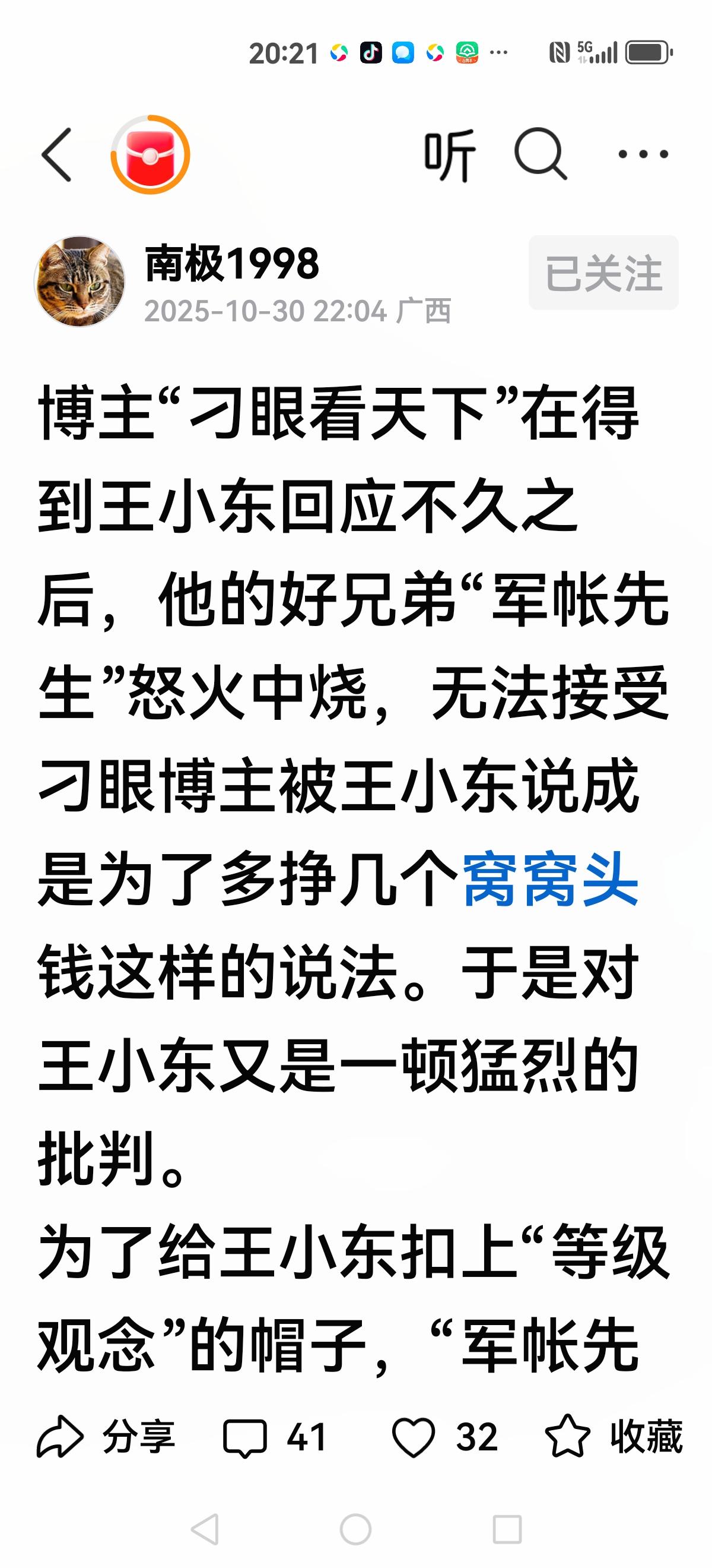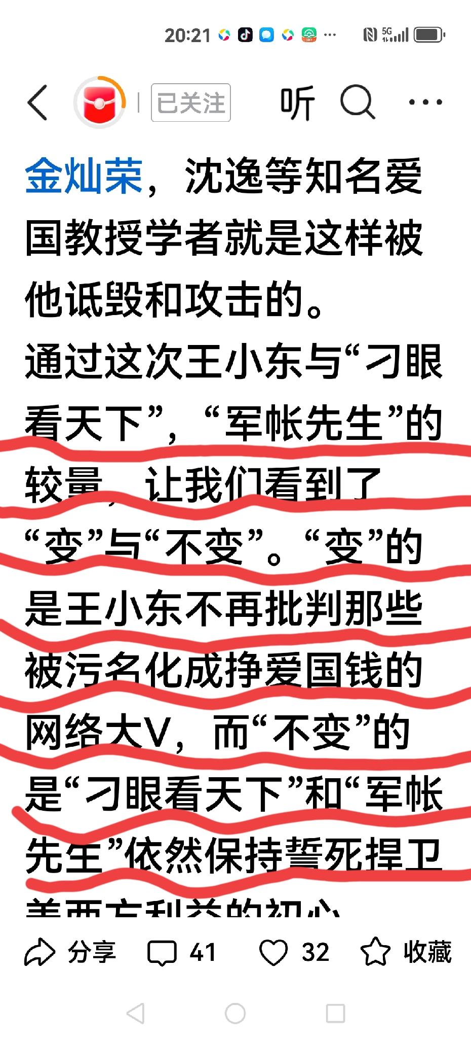【有些人又在意淫了】 这一次王小东批胡适,引发地震,我还是客观看问题,这次批胡适是王小东有点玩过火了,作为两本书的作者(中国不高兴)(天命所归是大国)王小东,能在司马南猖獗年代,挺身而出说明“变了”, 在一片俄乌战争中,张维为力挺俄罗斯,凭一己之力挑战单极世界,王小东嗤之以鼻。也是“变”。 批胡适的确是想换个角度,找个话题,没想到大意失荆州啊。 面对众人指责,没有保持定力,正如“刁眼”所言本来只是浅谈而已,没想到“窝头钱”引发双方火力全开。 这里不如探讨王小东到底如何?有时放不下架子,或者一种孤傲也会翻车。 这里我要讲有些人却开始意淫了,把王小东拉入自己的一派,甚至说王小东“改变了”和张维为一起了,说刁眼看天下和军账先生“不变”。 到底如何?让子弹飞一会吧!