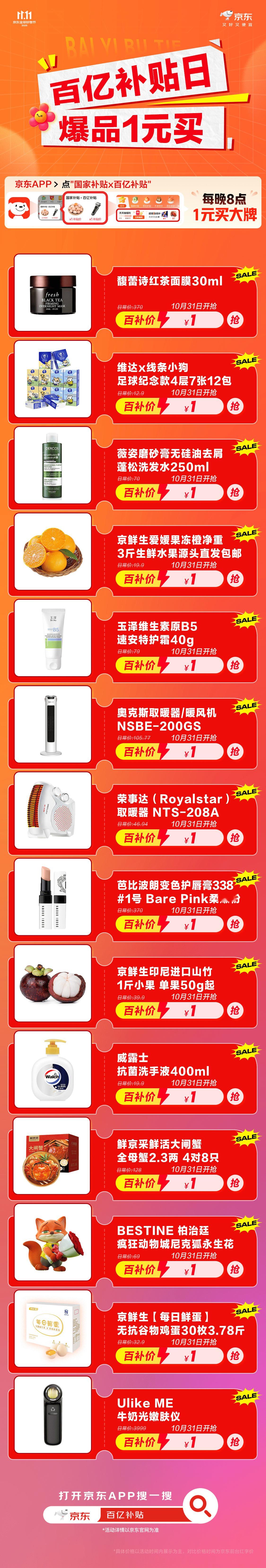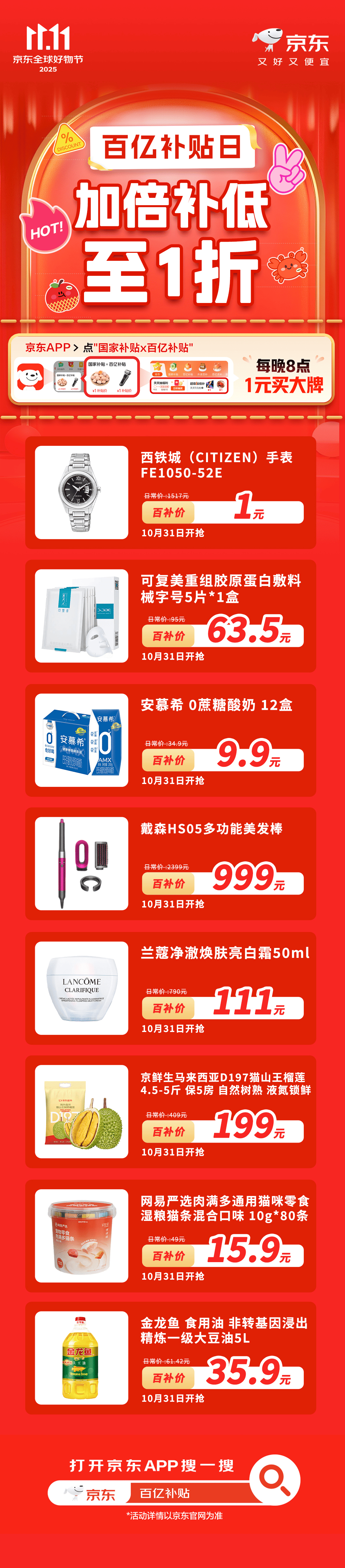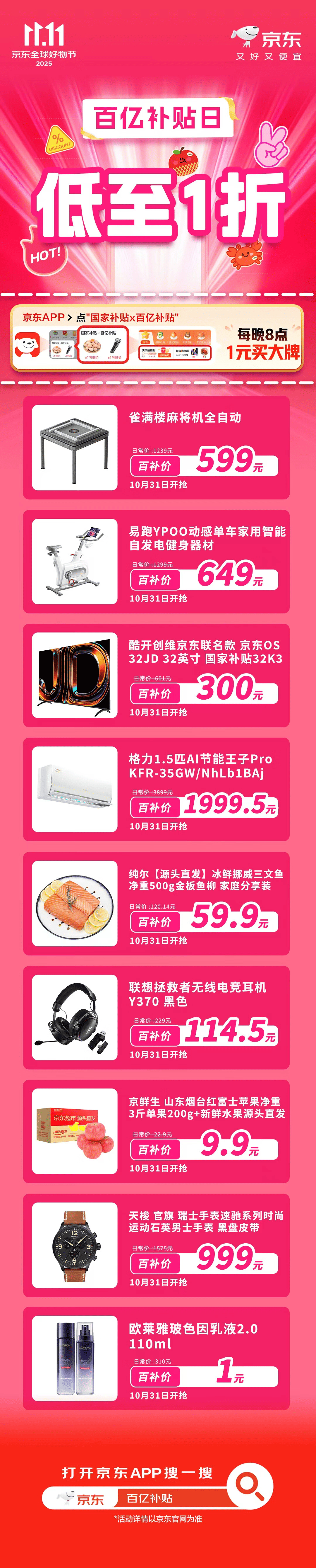有些消息是听不得的,比如京东百亿补贴日来了,百吋的电视能参与1元抢,还有各种大牌爆品低至1折,连续3天疯狂加补,听说最高直接省下万元,这谁听了还能安心上班啊!10月30日晚8点,京东11.11连续3天,疯狂加补!直接降价不凑单!又好又便宜的11.11 只在京东!京东百亿补贴1元买百吋电视 京东11.11 又好又便宜 京东11.11直接降价不用凑单 京东11.11今日请客
