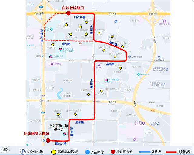 地铁快巴20路由地铁国凯大道站始发,途经国凯大道、沛友路、沛阳路、金阳路、金凯路、新屯路、壮锦大道(上行)、白沙大道、金阳路(下行)至白沙壮锦路口终点。沿途设置“地铁国凯大道站、沛友国凯路口(下行:国凯沛友路口)、沛阳沛友路口(下行:沛友沛阳路口)、金阳沛阳路口(下行:沛阳金阳路口)、金阳那洪路口、碧翠园学校、金凯金阳路口(下行:金阳金凯路口)、开平金凯路口(下行:金凯开平路口)、沛鸿开平路口、沛鸿金阳路口、普罗旺斯小学(北面)、壮锦槎路口(东面)、普罗旺斯社区(西面)、白沙壮锦路口”。营运时间:6:30-20:00,发车间隔:高峰期(15~20分/班)7:00—9:00、17:00—19:00,平低峰期(30~90分/班)6:30—7:00、9:00—17:00、19:00—20:00,视客流情况灵活调整;票价1元/人次,实行“站点响应式停靠”运营模式。