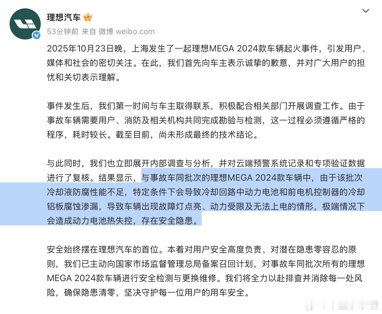 我们已经发现了导致事故的隐患,面对万分之一的风险我们不能等。事故可能是万分之一,但是生命只有一次,是百分之百。理想就车辆起火道歉理想汽车理想回应mega车辆起火