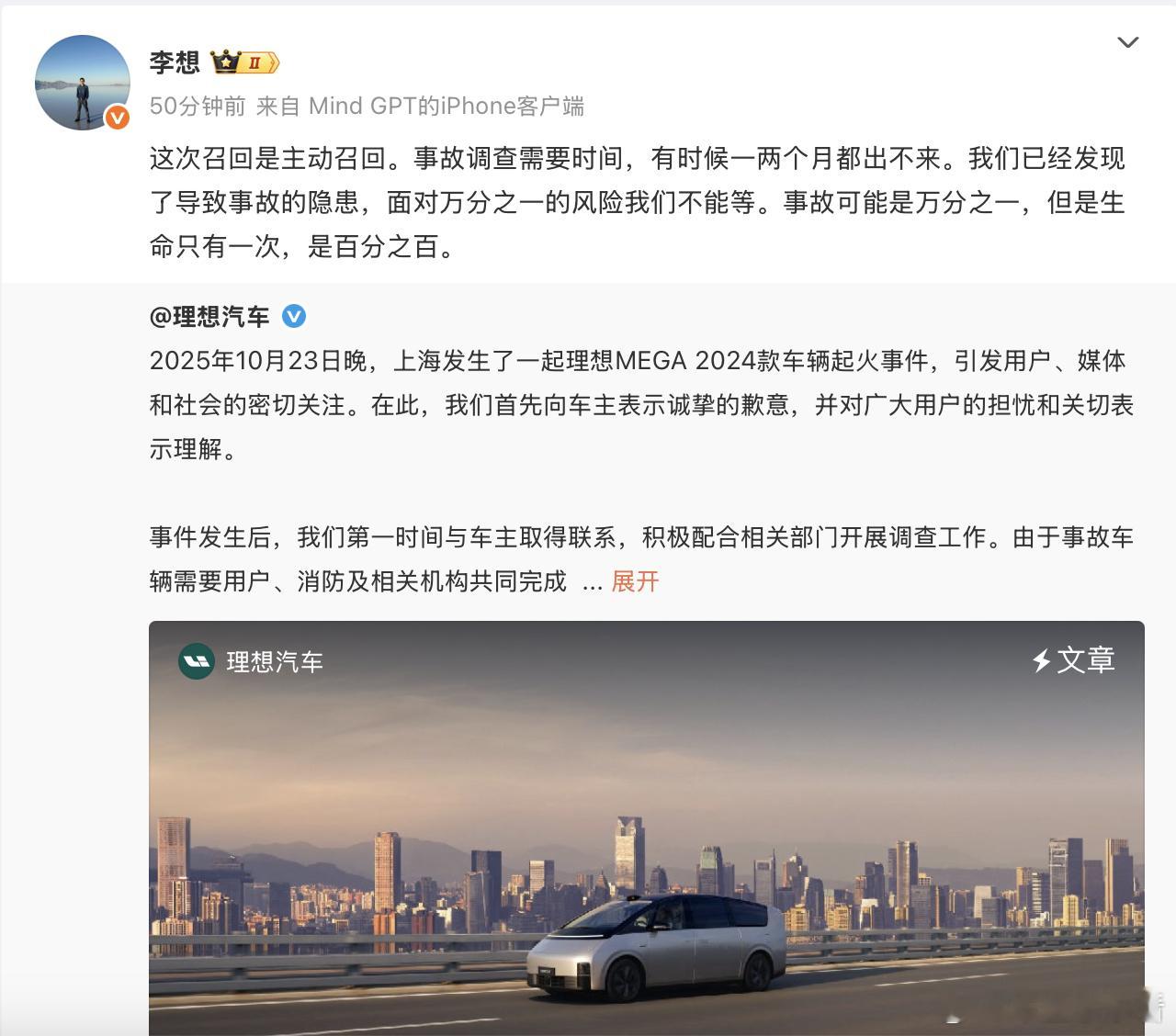 理想汽车 CEO 李想在微博发文称:这次召回是主动召回。(MEGA 车辆起火)事故调查需要时间,有时候一两个月都出不来。