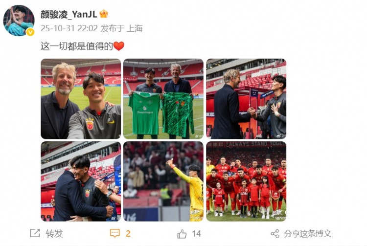 赛后,海港门将颜骏凌晒出了与偶像范德萨的合照,并写道:这一切都是值得的。