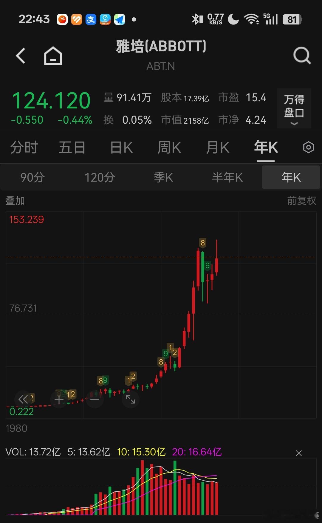 我丈母娘按了个心脏起搏器,发觉是雅培的然后查了一下股价,长期涨势确实惊人