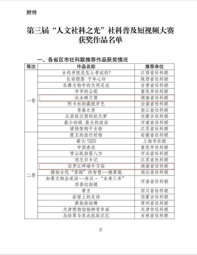 据了解,今年5-6月,怀化市社科联精心组织、广泛发动全市社科界积极参加由湖南省社科联、新湘评论杂志社联合开展的湖南省社科普及短视频大赛,推荐作品30余件。其中怀化市文化遗产保护中心创作的《沅水晒兰情》和湖南医药学院创作的《的前世今生》两部作品在全省512部作品中脱颖而出,双双获得省一等奖。同时怀化还获得二等奖2件,三等奖2件,获奖数量居全省前列。