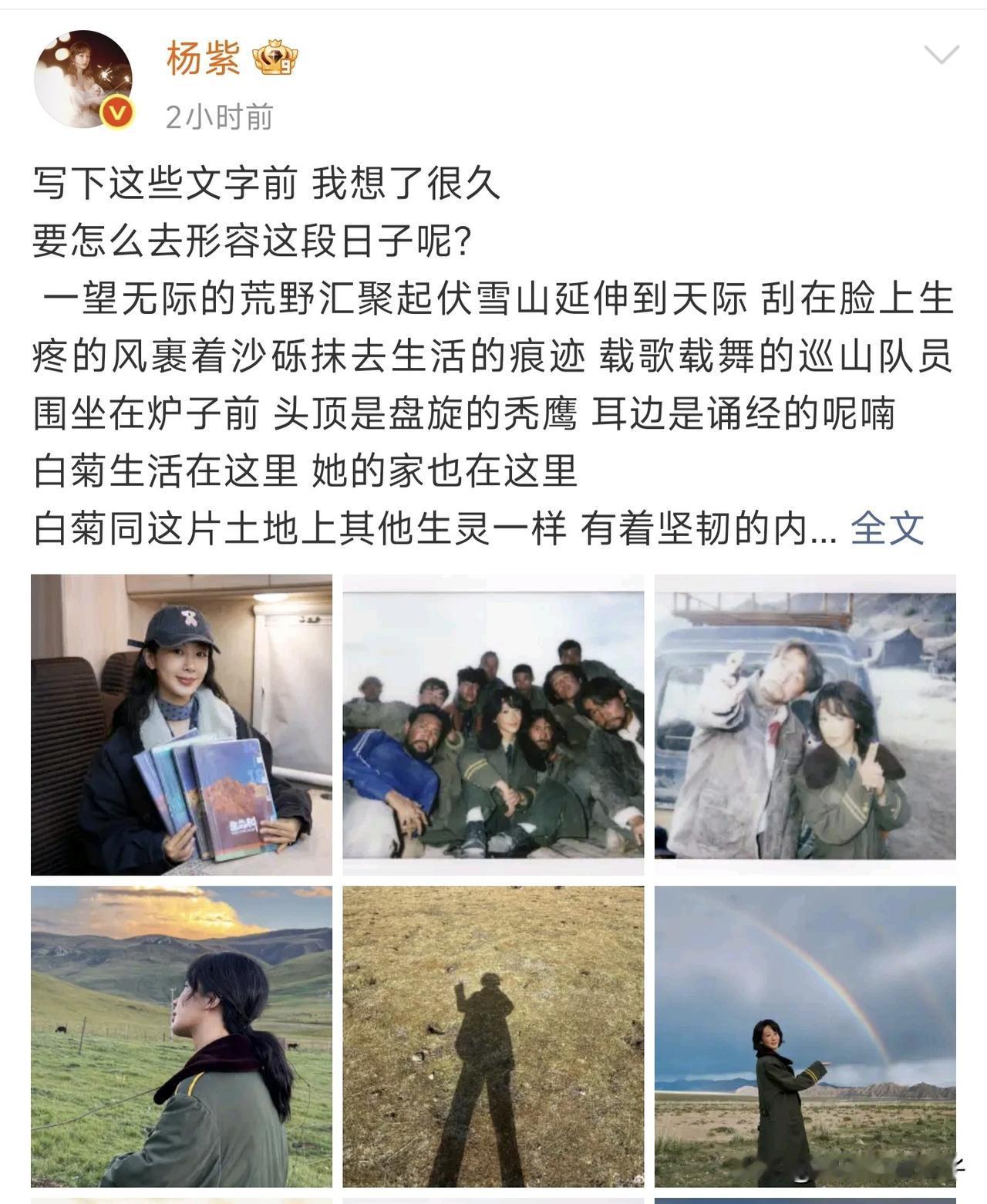 杨紫发文,谈及拍戏的感受,还晒出一组幕后合照! 10月31日,杨紫在社交平台发文,谈及拍戏时的感受,坦言要怎样形容这段日子?一望无际的荒野,连绵起伏的雪山,风里夹杂着沙粒,刮到脸上特别疼…… 由此可见,杨紫拍这部戏没少受苦,看剧照,为了角色,皮肤都晒黑了。 反而觉得,杨紫这次的造型,比以往的古装剧,或者偶像剧,更好看,也更充实。 作为演员就是要不断尝试和突破,适应不同的角色,拍摄环境差,也是一种历练。 看到这组幕后合照,感觉演员们平时相处的非常融洽,氛围也好,能跟梅婷这样的前辈合作,应该可以学到很多经验。 说实话,胡歌在剧中这个造型,如果没看到演员列表,差点认不出来,胡子拉碴,穿个大衣,一点不修边幅。 能够放下偶像包袱,这是好事,用演技征服观众,那才厉害。 希望杨紫在演艺道路上越走越远,越走越宽,塑造更多经典的角色。