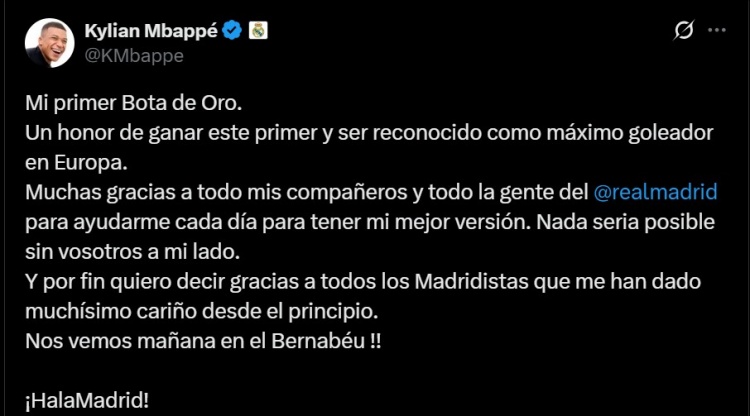 直播吧10月31日讯不久前,获得欧洲金靴的皇马前锋姆巴佩更新社交媒体,感谢了队友和球迷的支持。