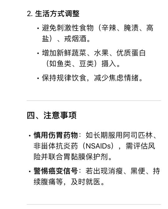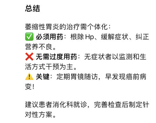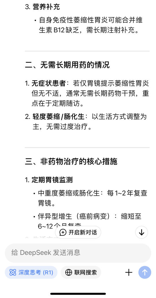 经常有人问萎缩性胃炎需要吃药吗?甚至有很多医生也建议吃药来逆转。还有各类广告说吃啥啥逆转了。Deepseek的回答靠谱多了[点赞R][点赞R]。只有这几种情况需要用药;需要杀菌、有症状(功能性)需对症处理、以及A胃缺乏某些元素的需要补充。其他没有症状的杀完菌的萎缩性胃炎不建议用药,只需要改善生活方式,放松心情,定期复查。 帮你们试过了,以后遇到专业问题除了查攻略,还能问Deepseek。
