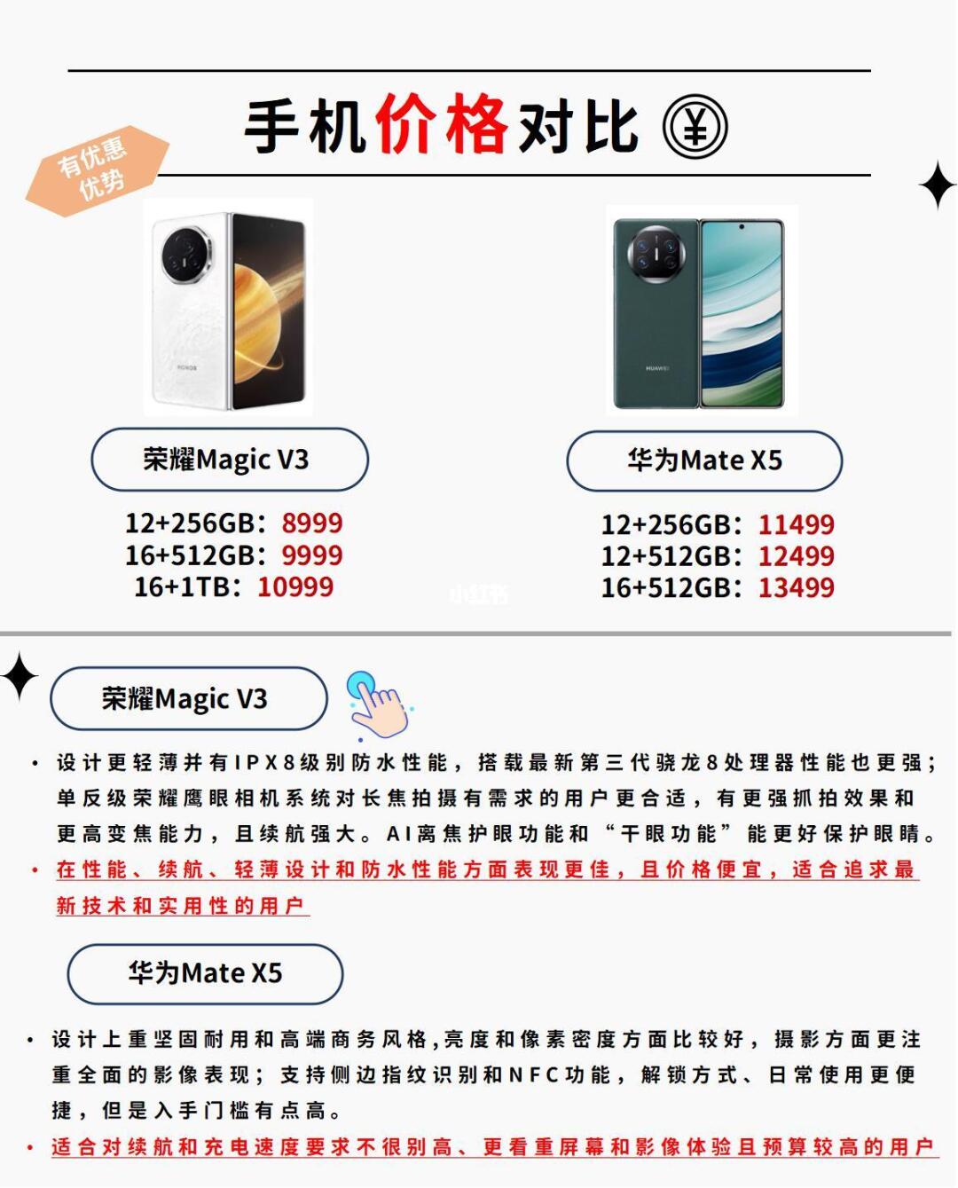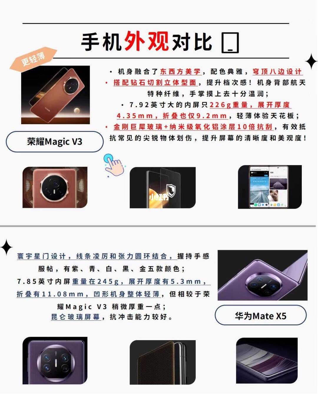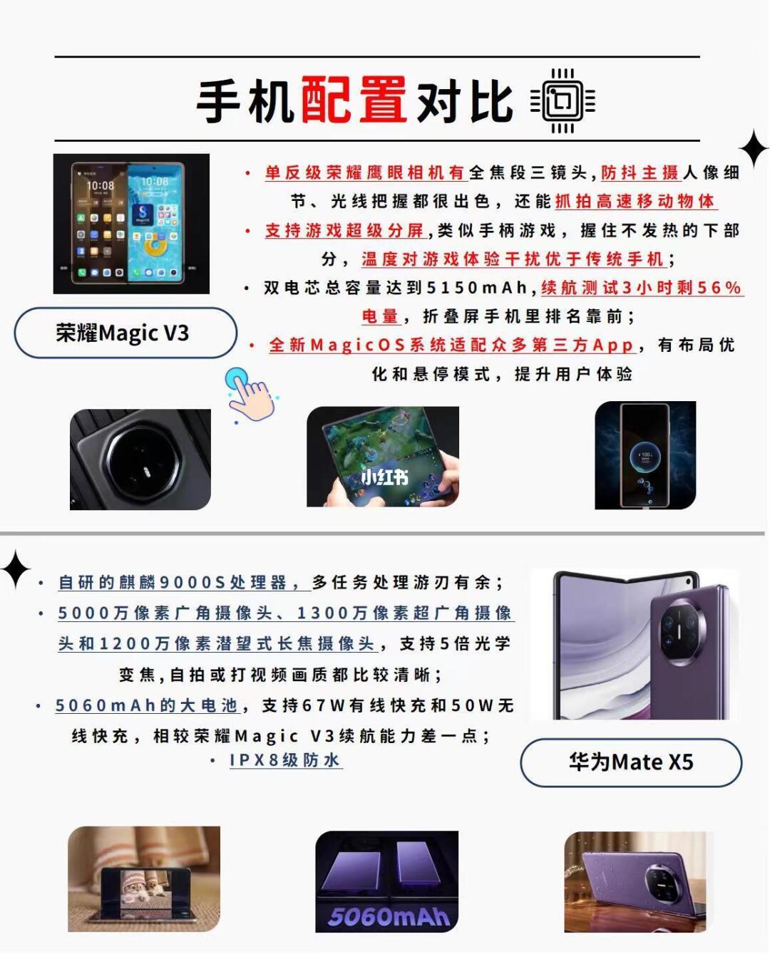 🔺华为Mate X5自研的麒麟9000S处理器,可多任务处理;5000万像素广角摄像头、1300万像素超广角摄像头和1200万像素潜望式长焦摄像头,可5倍光学变焦;5060mAh电池但相较荣耀差一点