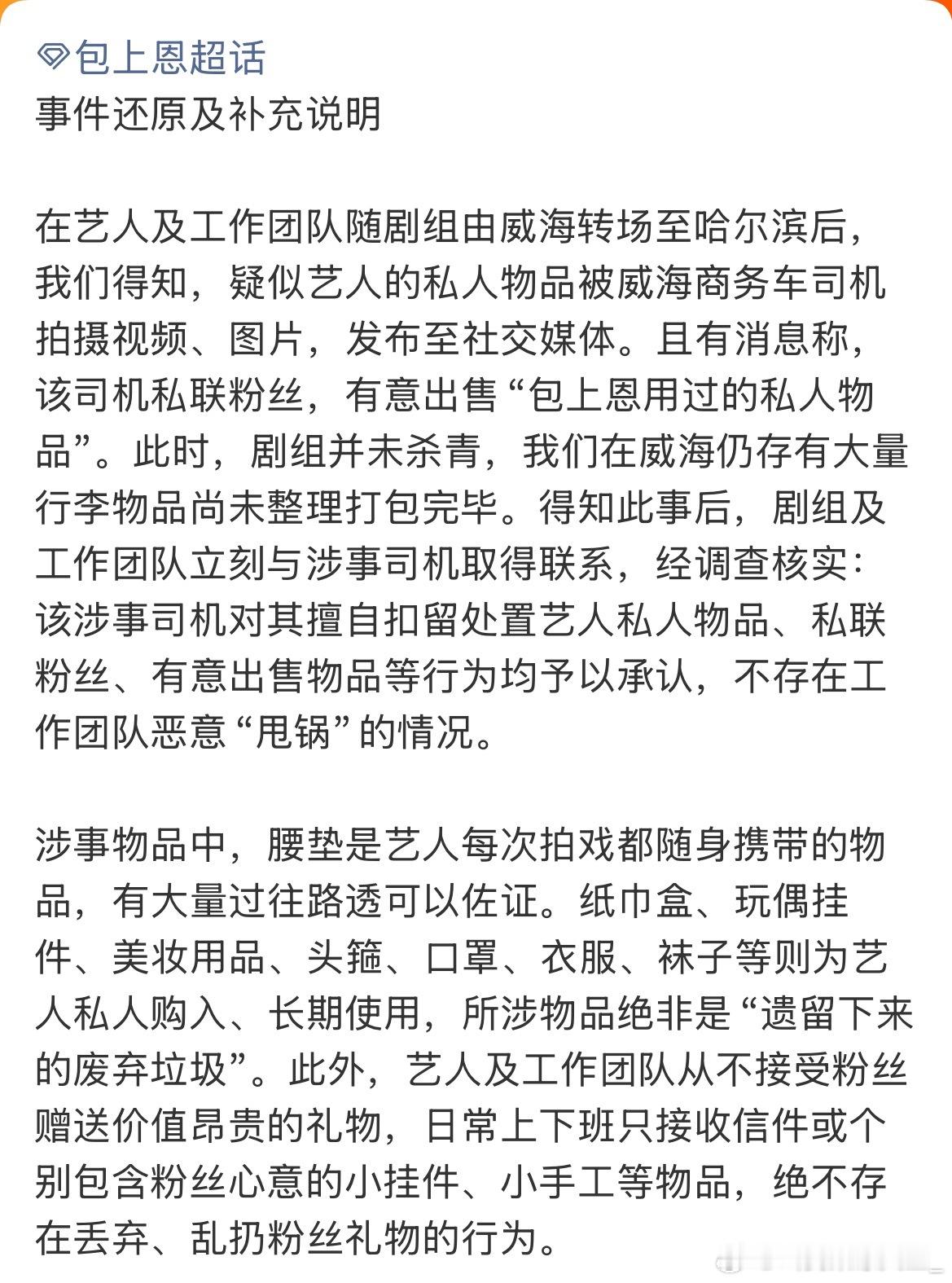 包上恩司机包上恩脱粉的粉丝爆料,说其实是包上恩自己不要的东西,都丢给了司机处理,