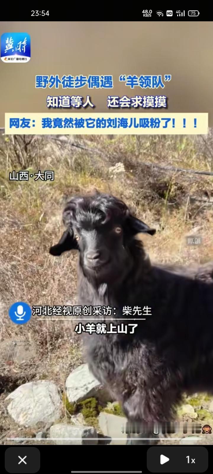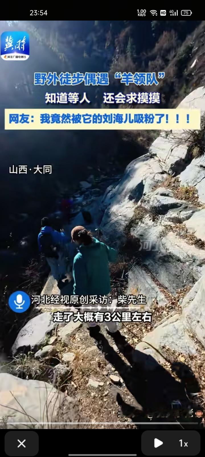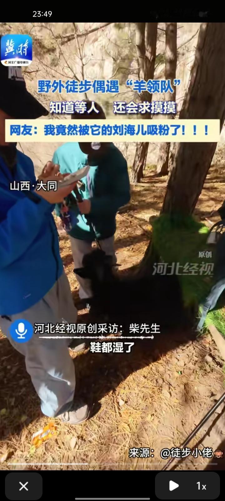 10月28日,山西大同。野外徒步遇到一只小黑羊,知道等人,还会求摸摸。 柴先生称,这两天山里温度比较低,过河要踩的石头上结了很厚一层冰,当时已经踩在水里,鞋都湿了。当时坐在岸边往外倒鞋子里的水,这个羊突然出现了,吓了一跳。小羊是领路的,因为当时那条路线有很多条走法,走了大概三公里左右小羊就上山了。