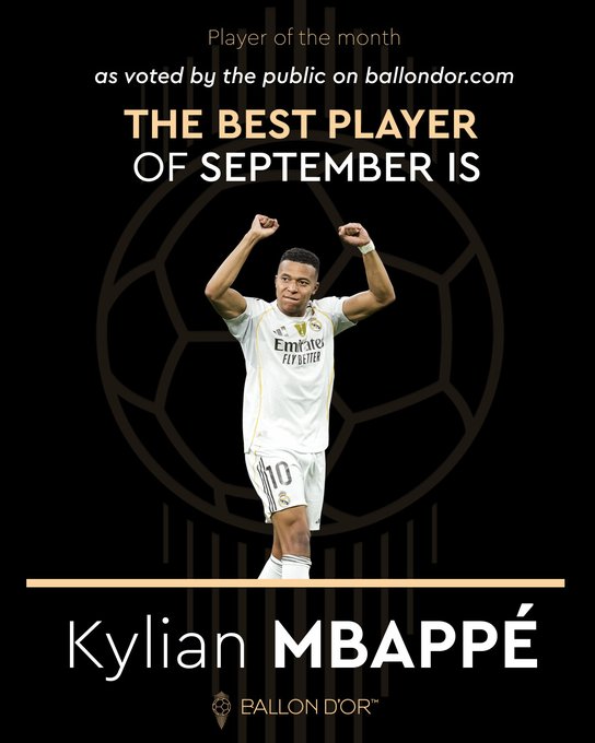 虎扑10月31日讯金球奖官方宣布,经过球迷投票,姆巴佩当选金球奖9月份最佳球员。