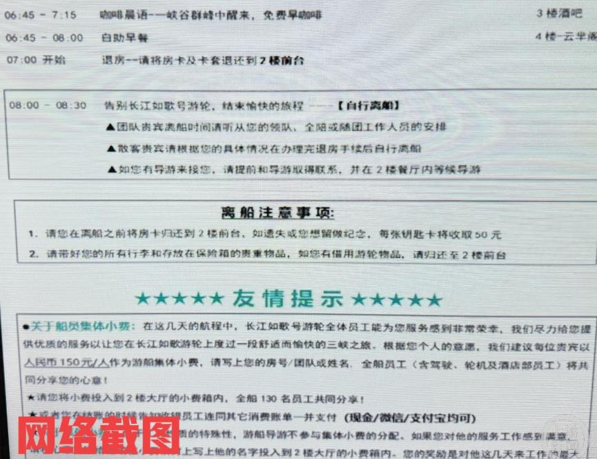 湖北有男子和朋友一起出游。 这次是乘坐游轮游玩,可在上船后,有服务人员提醒要求支付小费一百五十元,男子当时也是惊讶,后没当一回事,还与朋友们说起此事,最后一日时,男子在自己房间内发现了装小费的信封袋。 男子心里突感不舒服,如此赤裸裸表明要钱,心里有了隔阂,这分明在强制索要钱款,后游轮服务回应这是按照国外的一些习惯,国外游客都会支付有小费,现在作为仪式保留下来,但不强制,留用信封袋也是方便之意。 如此一事立马引来众人热议,有人觉得支付小费情有可原,有人却说既然购买了船票,为何还要再收取其他费用,还故意放置小费信封,这分明就有点强制了。 其实这里也可以以其他的方式保持与游客的共鸣,小费仪式在我们的意识里还是没有多少习惯,游轮服务可以改变方式,让游客自行体会,可以如有打赏行为,如此一来不是更好吗。 游轮公司的用意要表明清楚,如此一来难免不会让人多想。