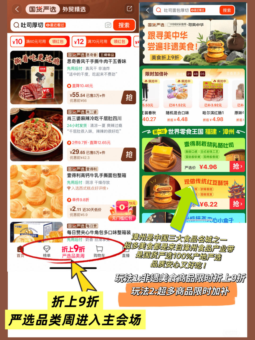 上🍑🔍国货严选,严选品类周进入主会场第一站:福建漳州世界零食王国,超多美食都是来自漳州食品产业带,还有非遗美食折上9⃣️折,和超多商品加倍补的活动👍