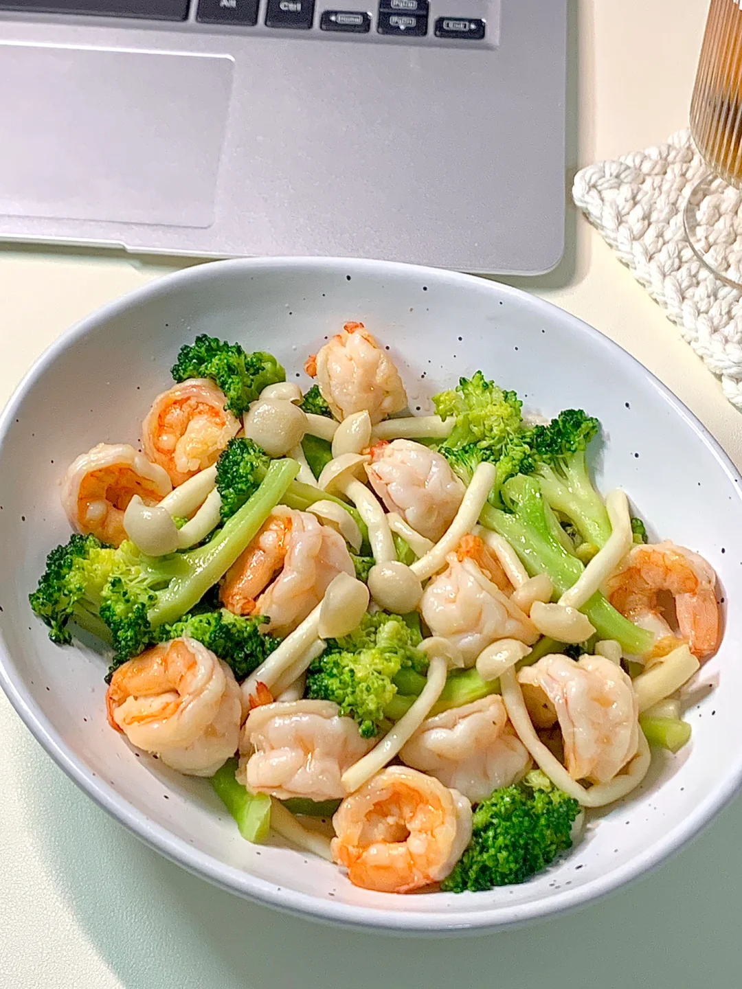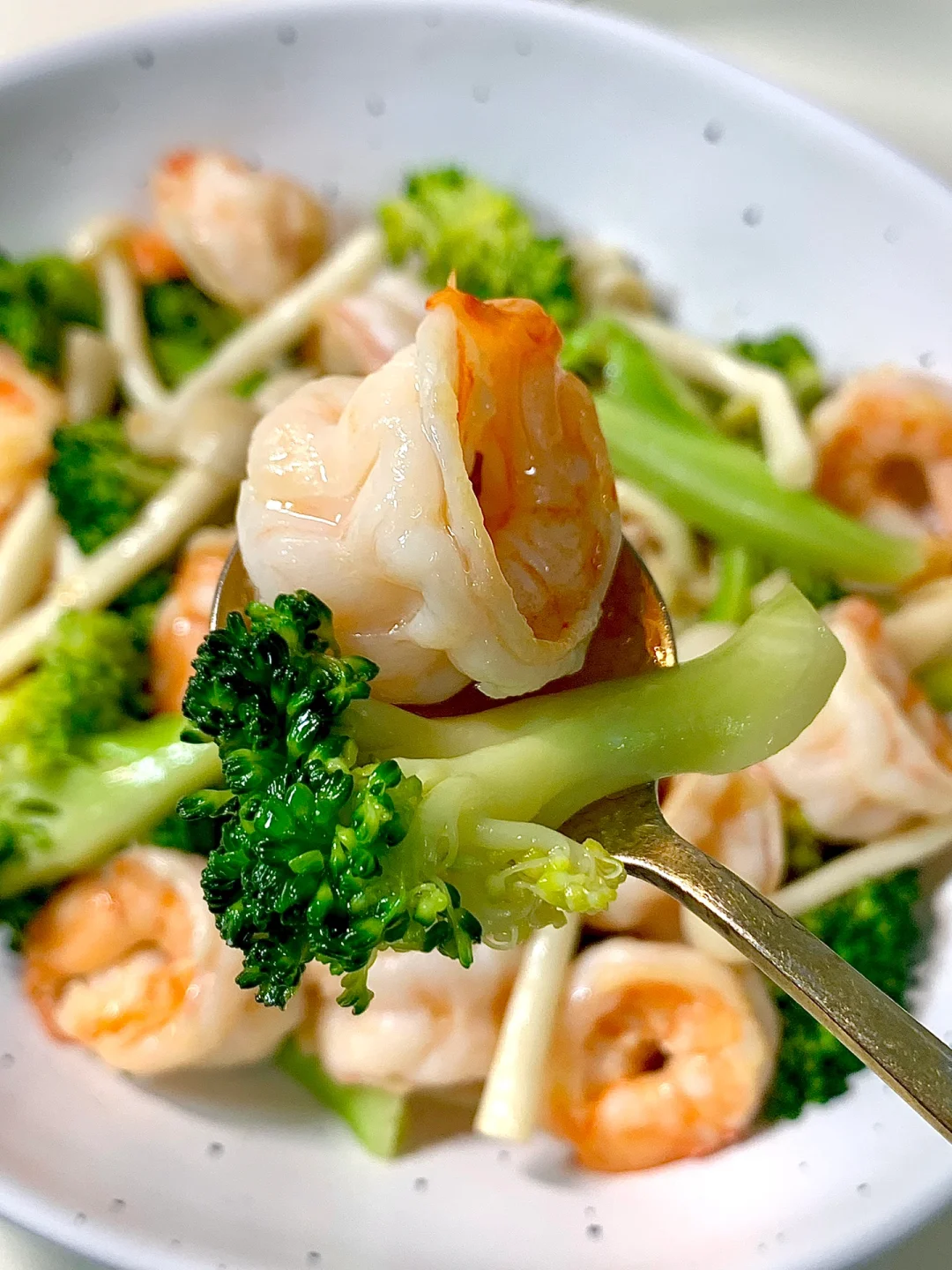 食材:西兰花🥦半个、虾仁10只、适量白玉菇、蒜头3瓣、蚝油1勺、适量盐