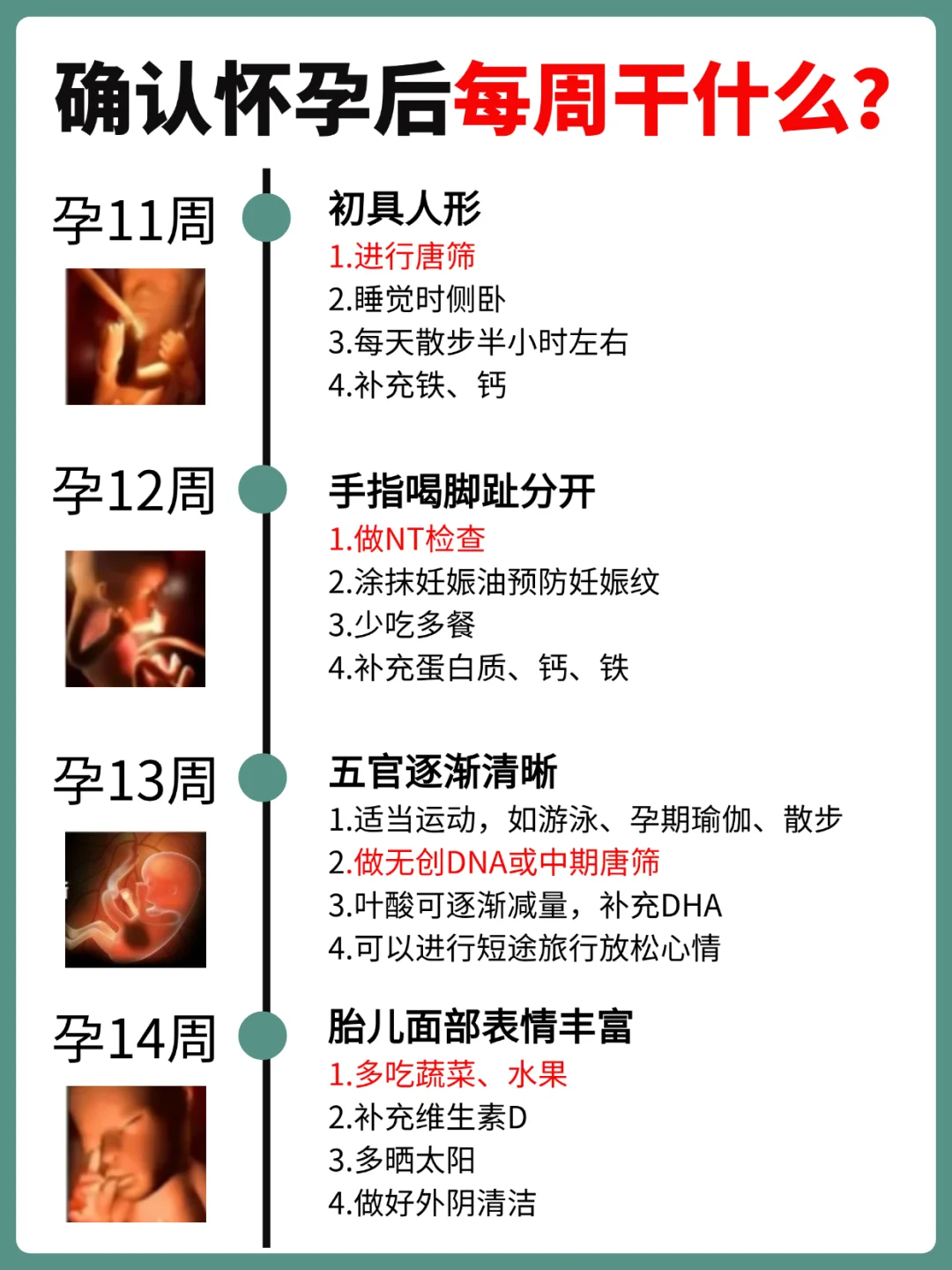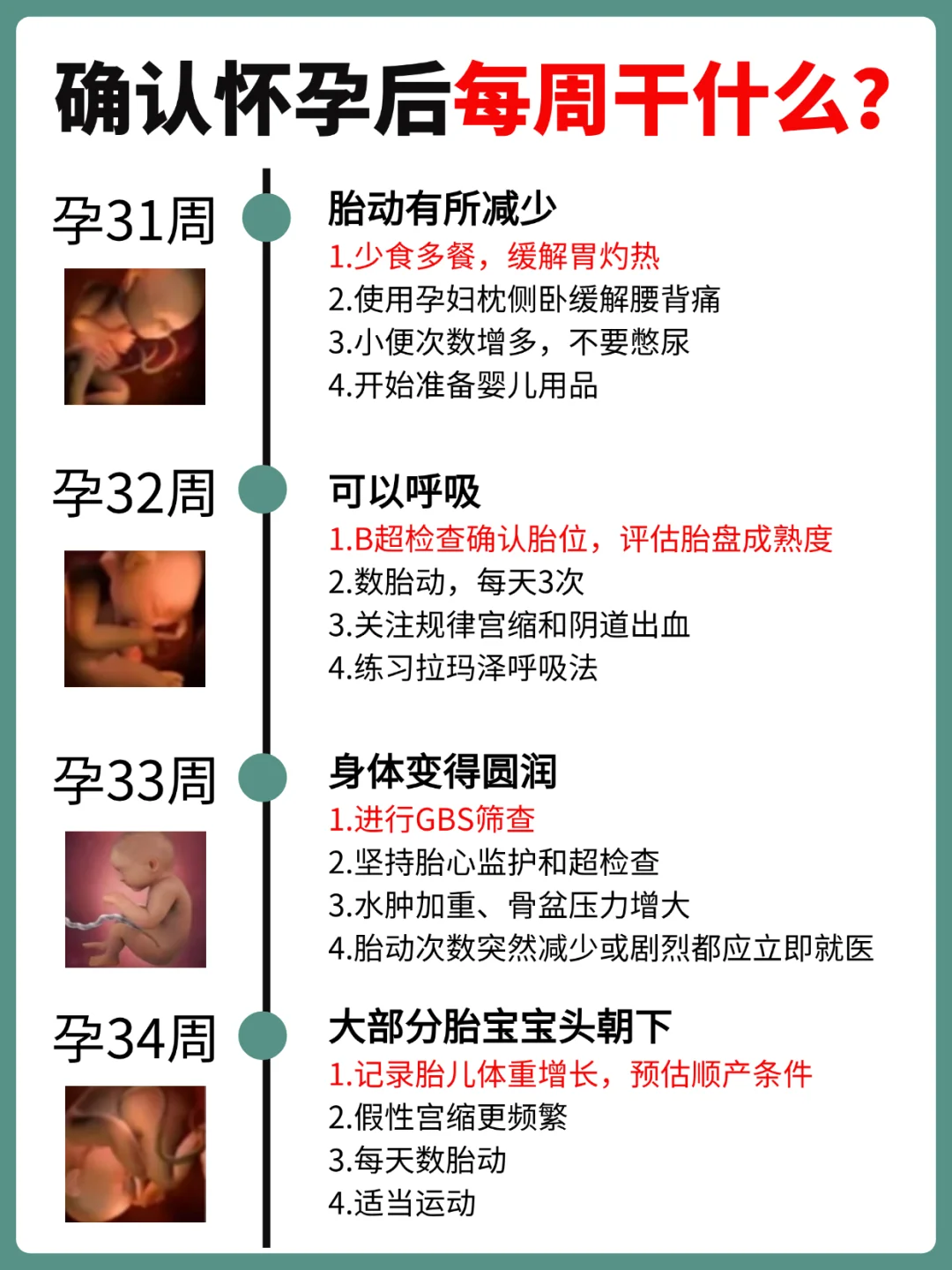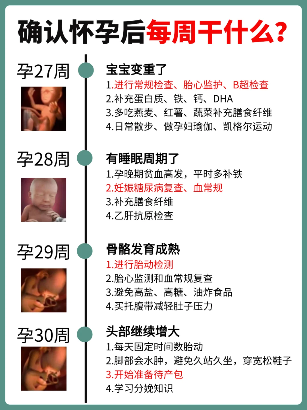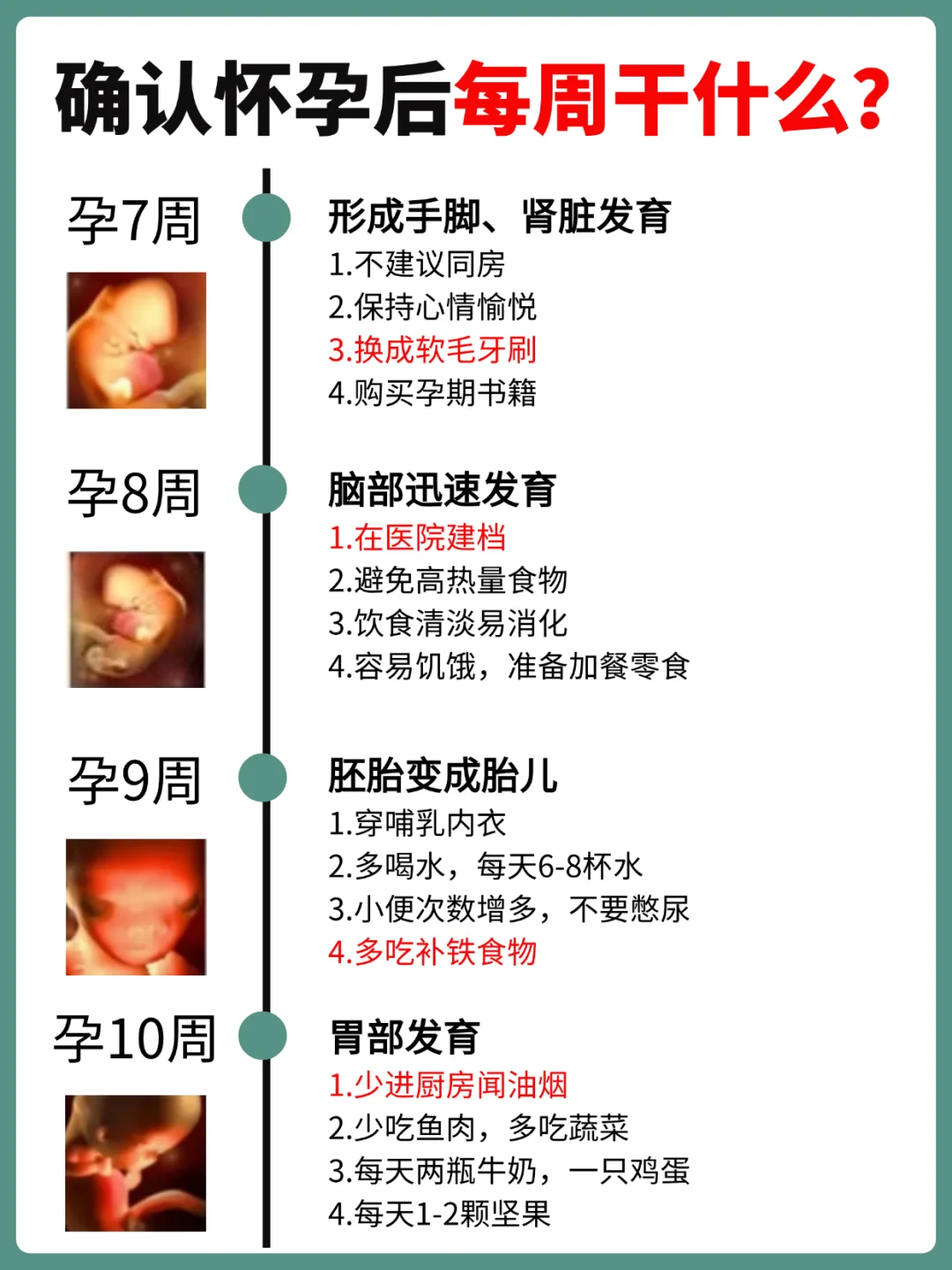 第一次怀孕,难免会手无足措,这里整理了怀孕时每周要做的事情 内容包含👉胎儿发育进程+注意事项+产检事项 非常干货! . 第一次怀孕的准妈妈,建议收藏慢慢看✔️