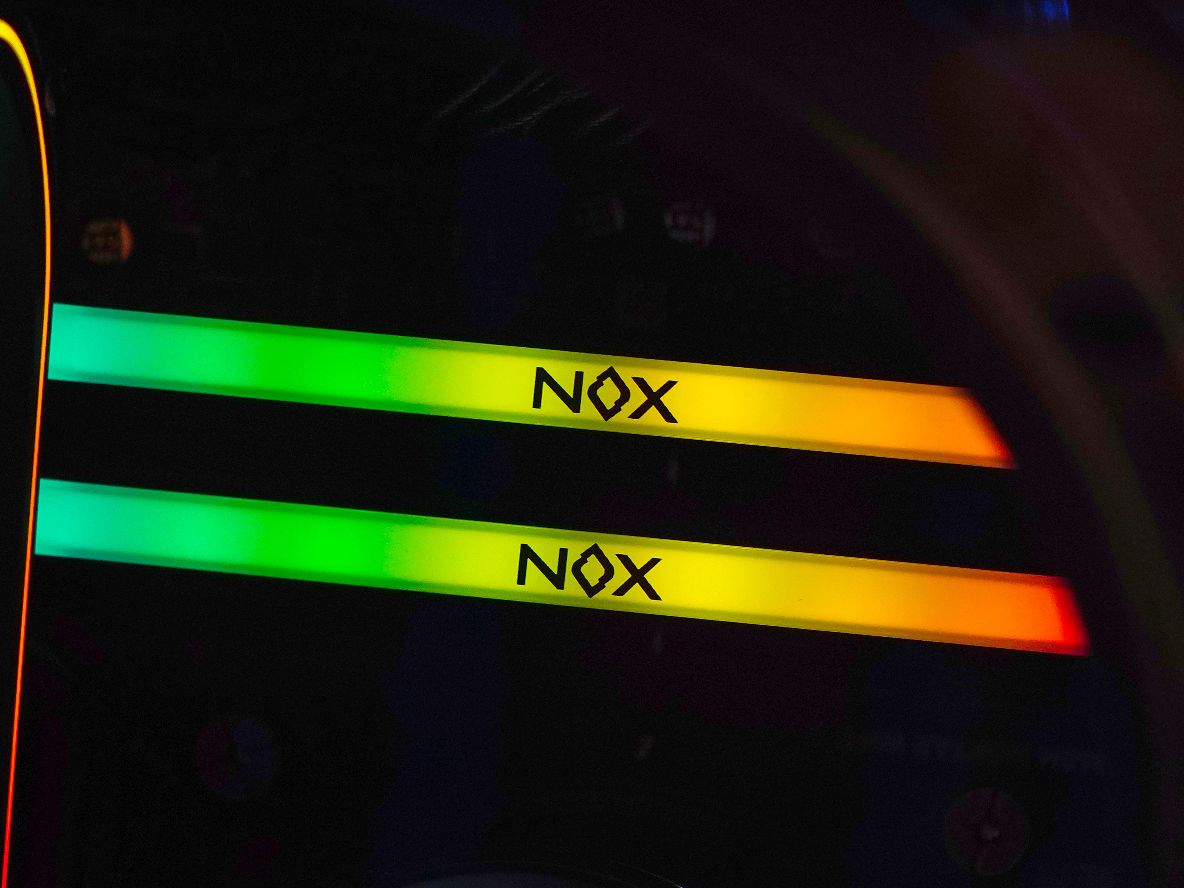 ▼内存顶部为大面积的白色导光条,中间位置有NOX标识,点亮后具有广角漫射灯效,并支持各大板厂ARGB灯控。