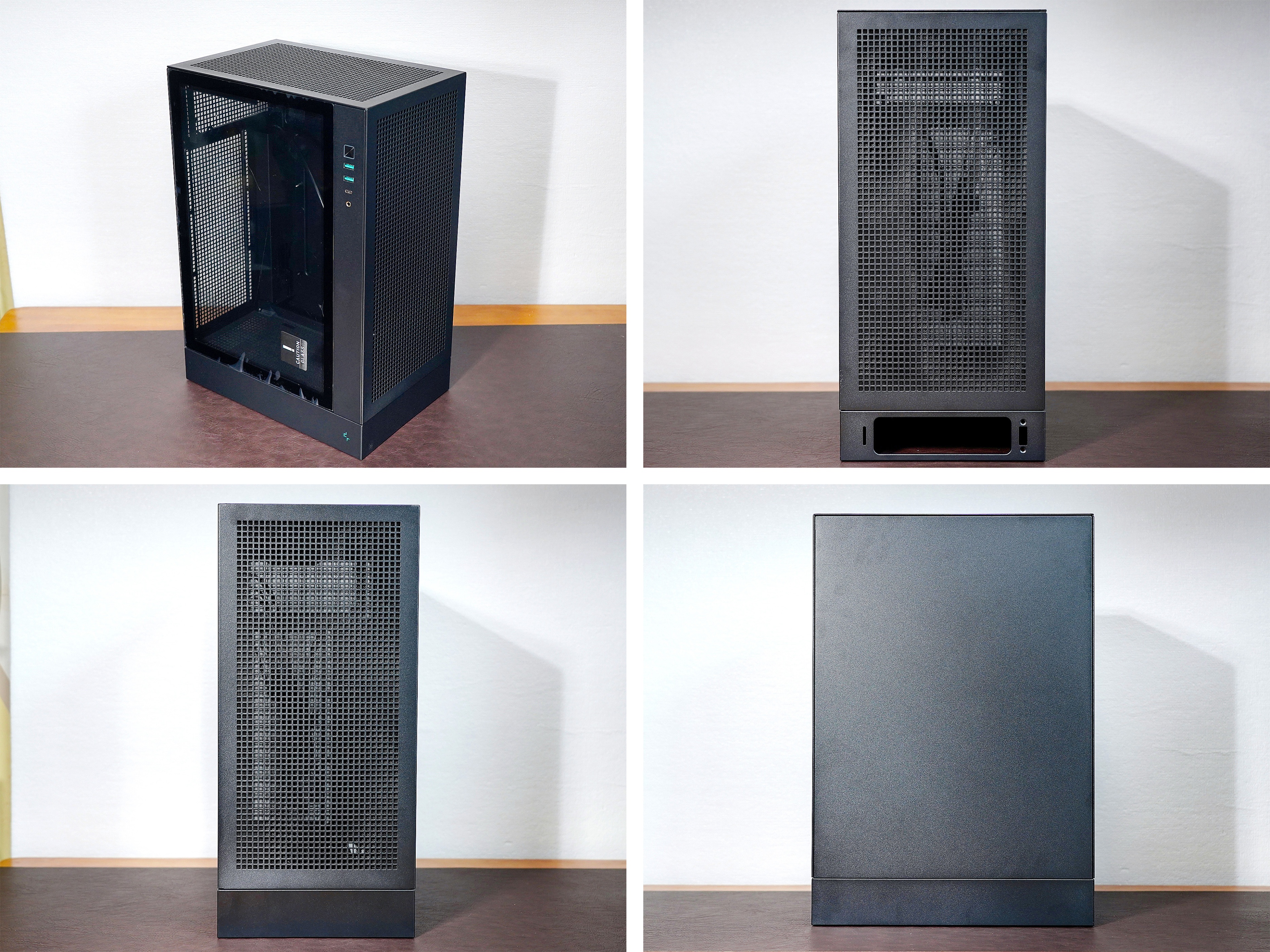 ▼机箱尺寸为290mm*195mm*424.5mm(L×W×H),体积 21L,重量4.4Kg,造型方正,一侧为玻璃,一侧为钢板,两侧为MESH 面板,顶部也是MESH 面板。底部为一个比较高的底座,一面留有走线的通道。相当于把电源前置,显卡直插的MATX机箱结构直立起来了。