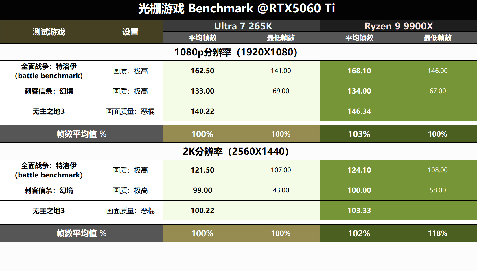 ▼不管是1080分辨率还是2k分辨率,265k的表现不如9900X,但落后幅度只有2~3%,十分微弱。