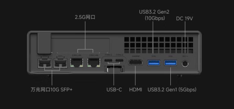 扩展接口上除了我们上文中提到的两个万兆网口和两个2.5g的网口之外,背部还有还有两个USB-C接口,一个HDMI的接口以及USB 3.2 GEN2/1接口各一个,剩下的就是一个DC19V的电源接口了。