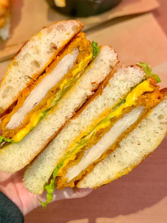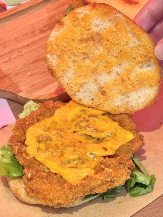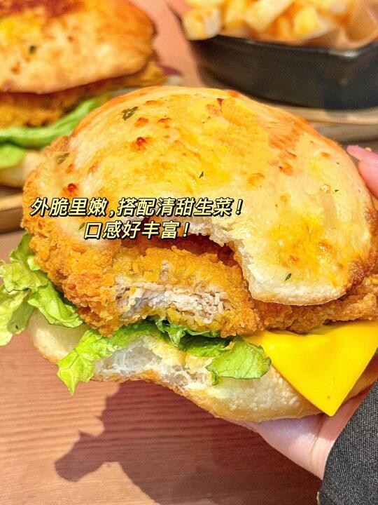 中间的鸡排外酥里嫩,超级香脆,趁热吃肉质超嫩还会爆汁!