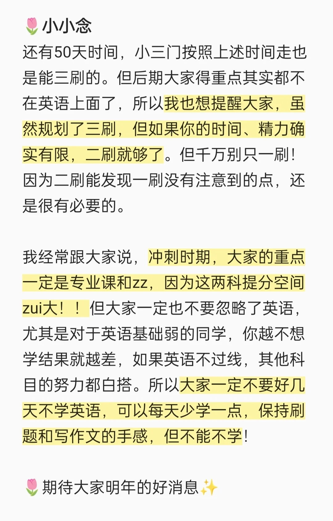 还有50天时间,小三门按照上述时间走也是能三刷的。但后期大家得重点其实都不在英语上面了,所以我也想提醒大家,虽然规划了三刷,但如果你的时间、精力确实有限,二刷就够了。但千万别只一刷!因为二刷能发现一刷没有注意到的点,还是很有必要的。