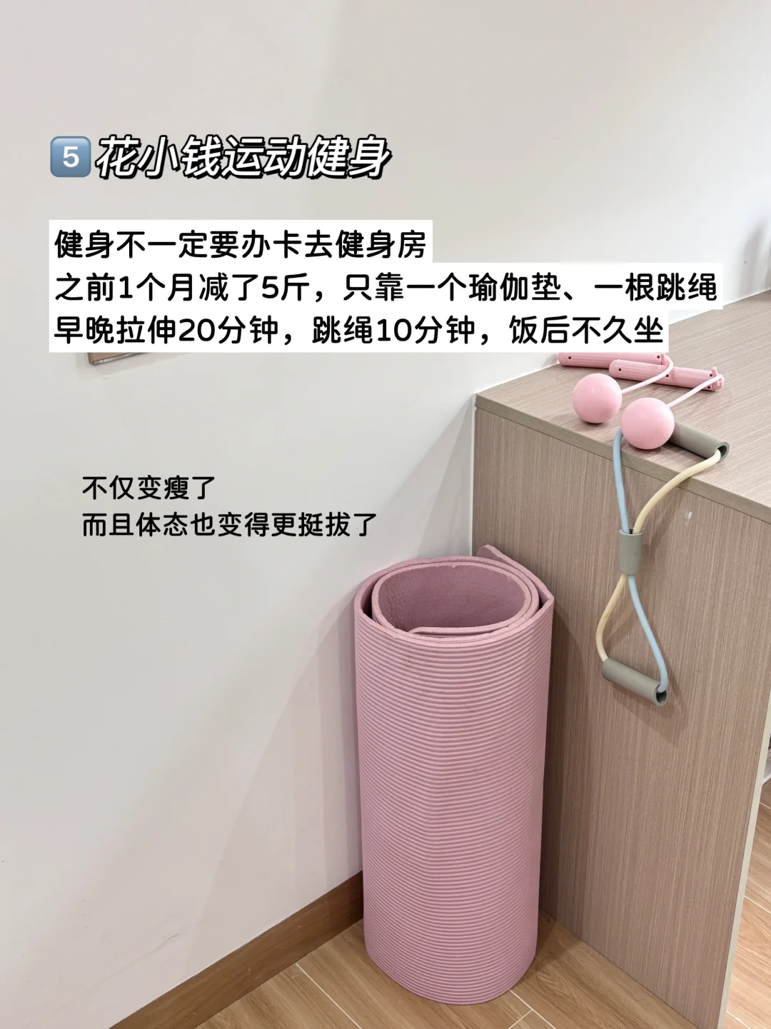 之前1个月减了5斤,只靠一个瑜伽垫、一根跳绳