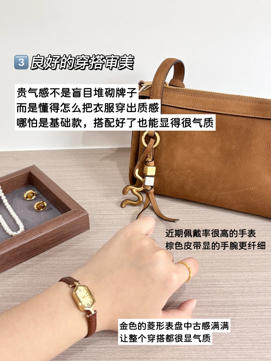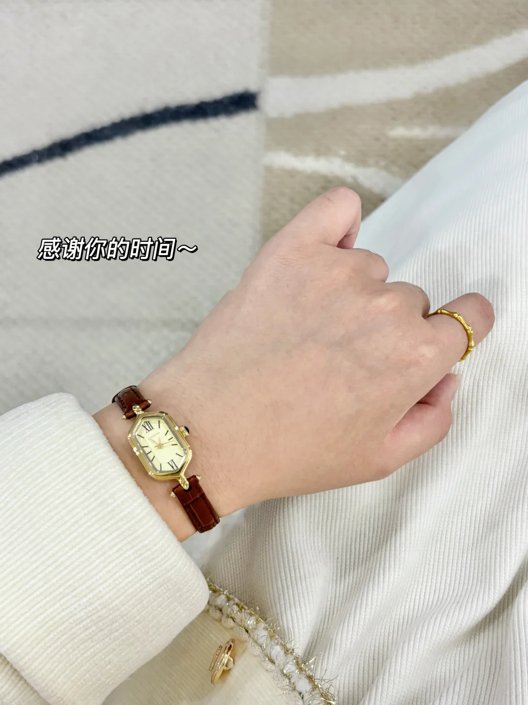棕色表带显得手腕纤细,金色欧式镜表盘中古感满满
