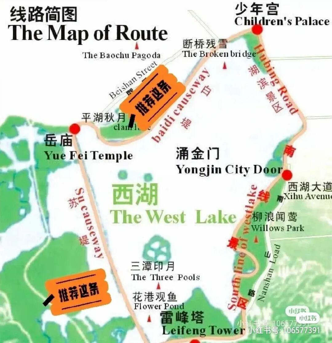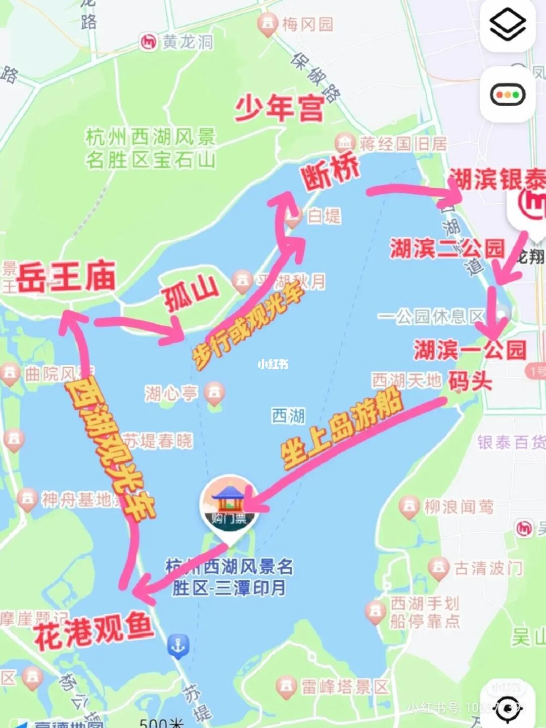 路线🥇:湖滨二公园-湖滨一公园-坐船上三潭印月岛-花港观鱼码头下船-苏堤-岳庙-断桥-湖滨银泰