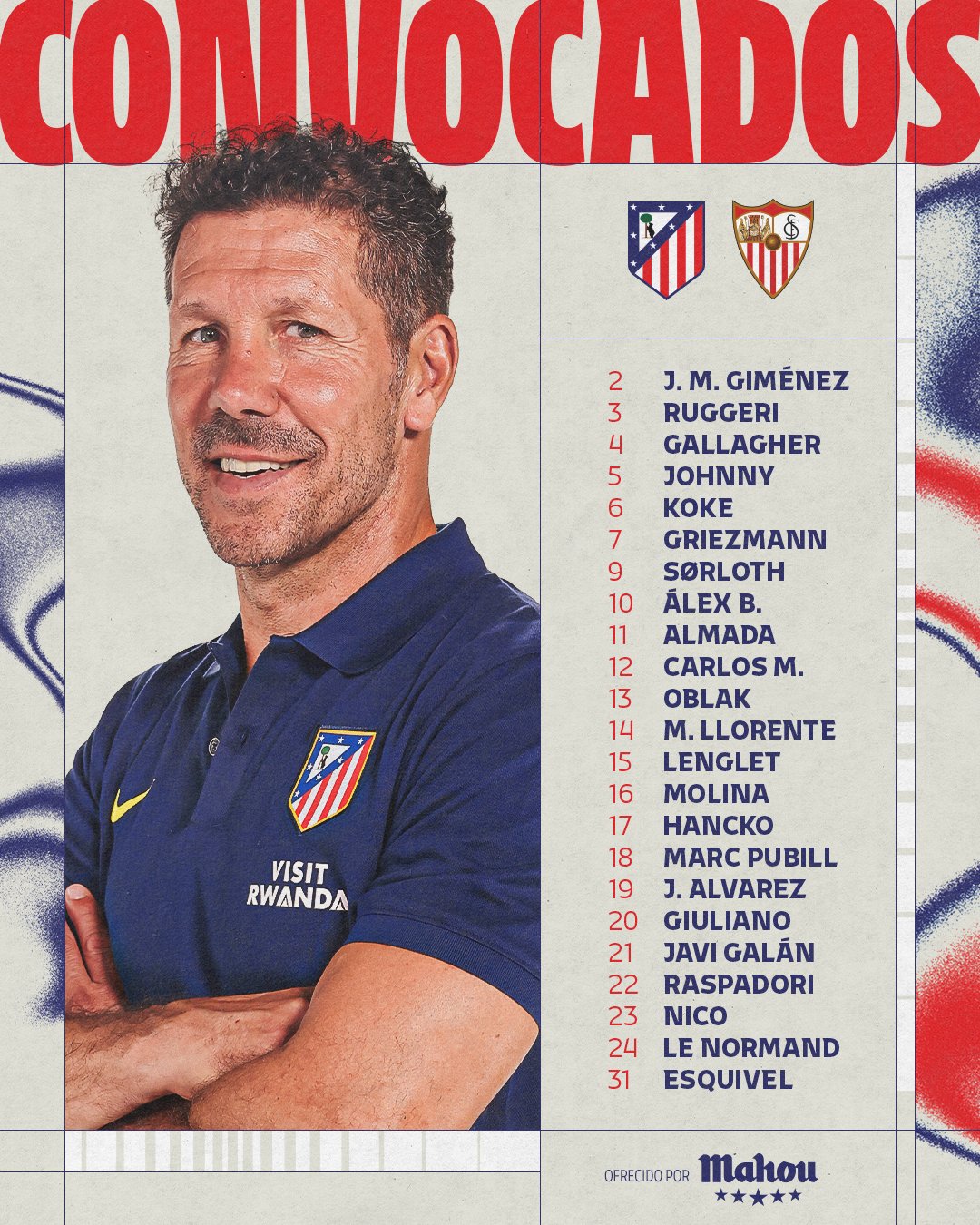 虎扑10月31日讯西甲第11轮,马竞主场对阵塞维利亚,马竞官方公布本场比赛大名单: