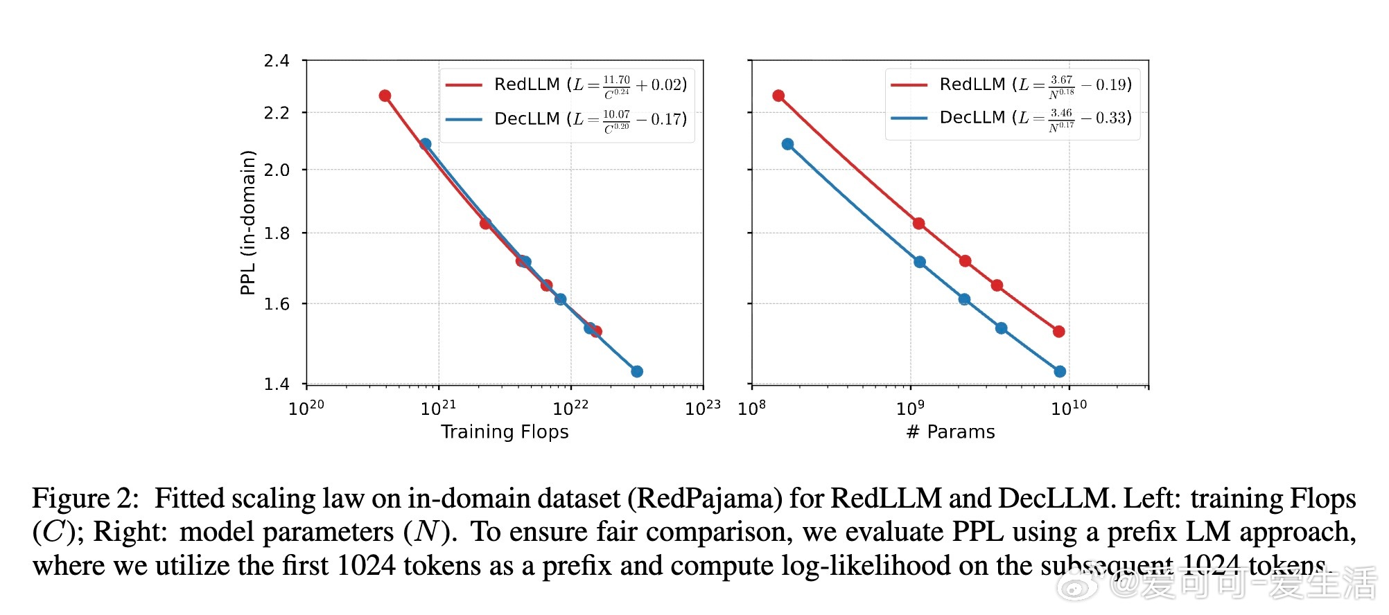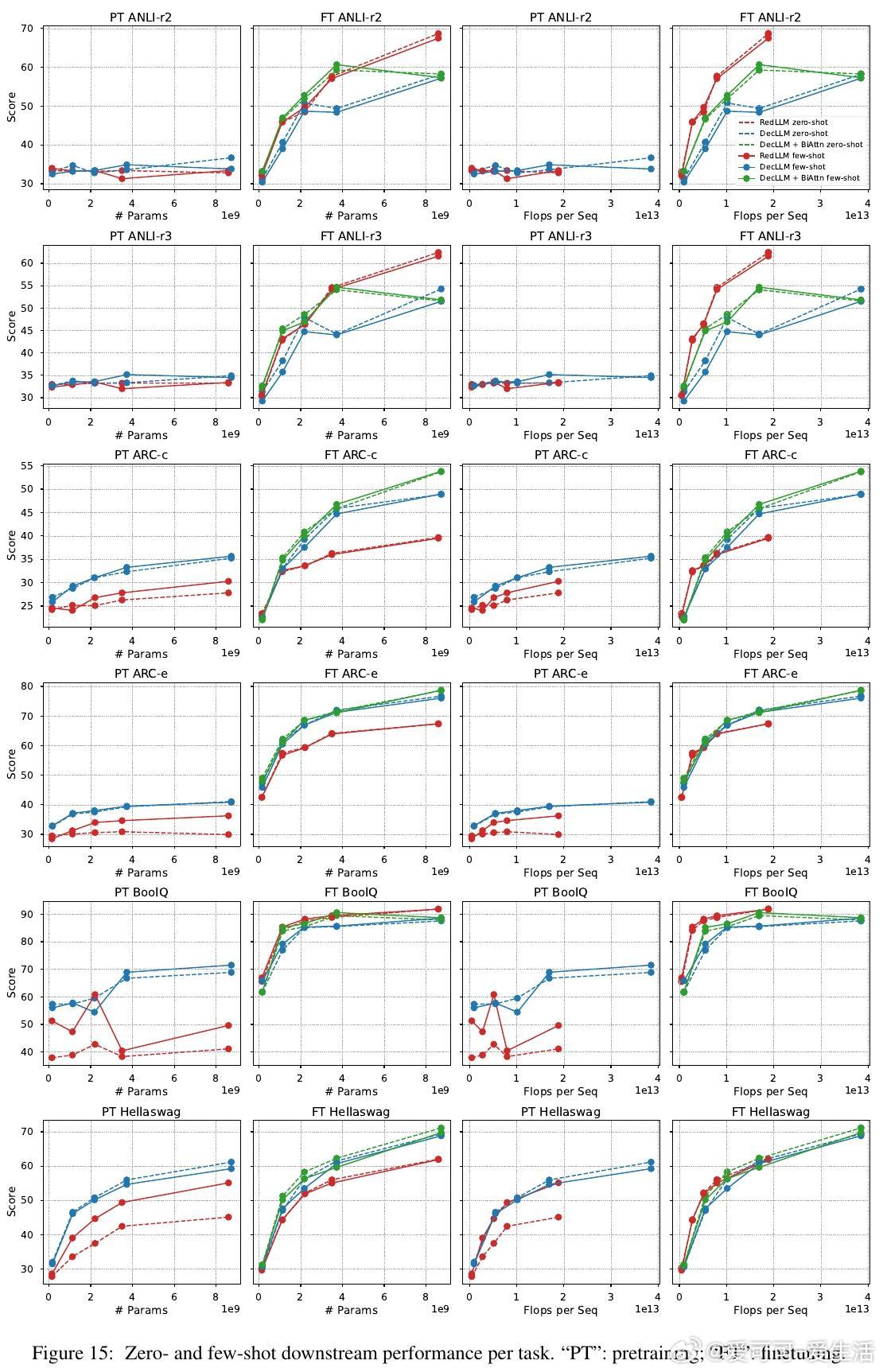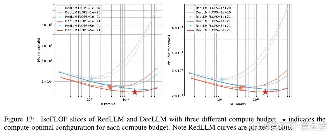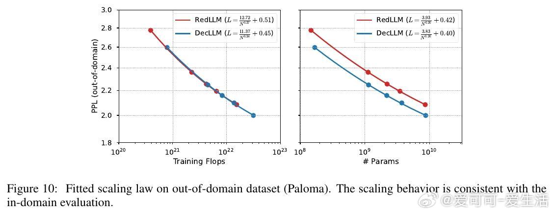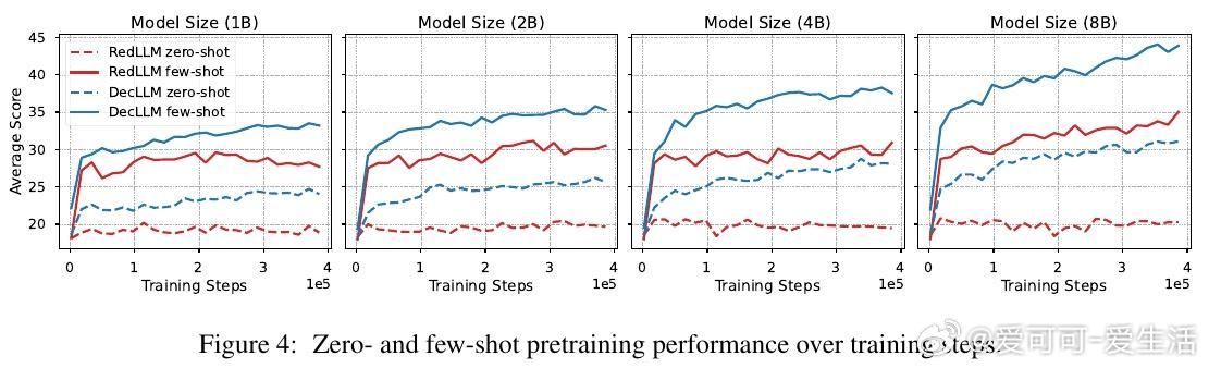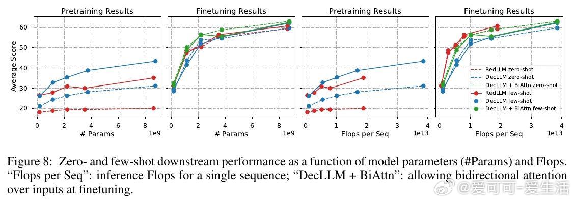 1. 预训练阶段,RedLLM与DecLLM在模型规模与计算量扩展上的表现相似,但DecLLM在计算效率上更优,尤其在零样本(zero-shot)和少样本(few-shot)学习上远超RedLLM。