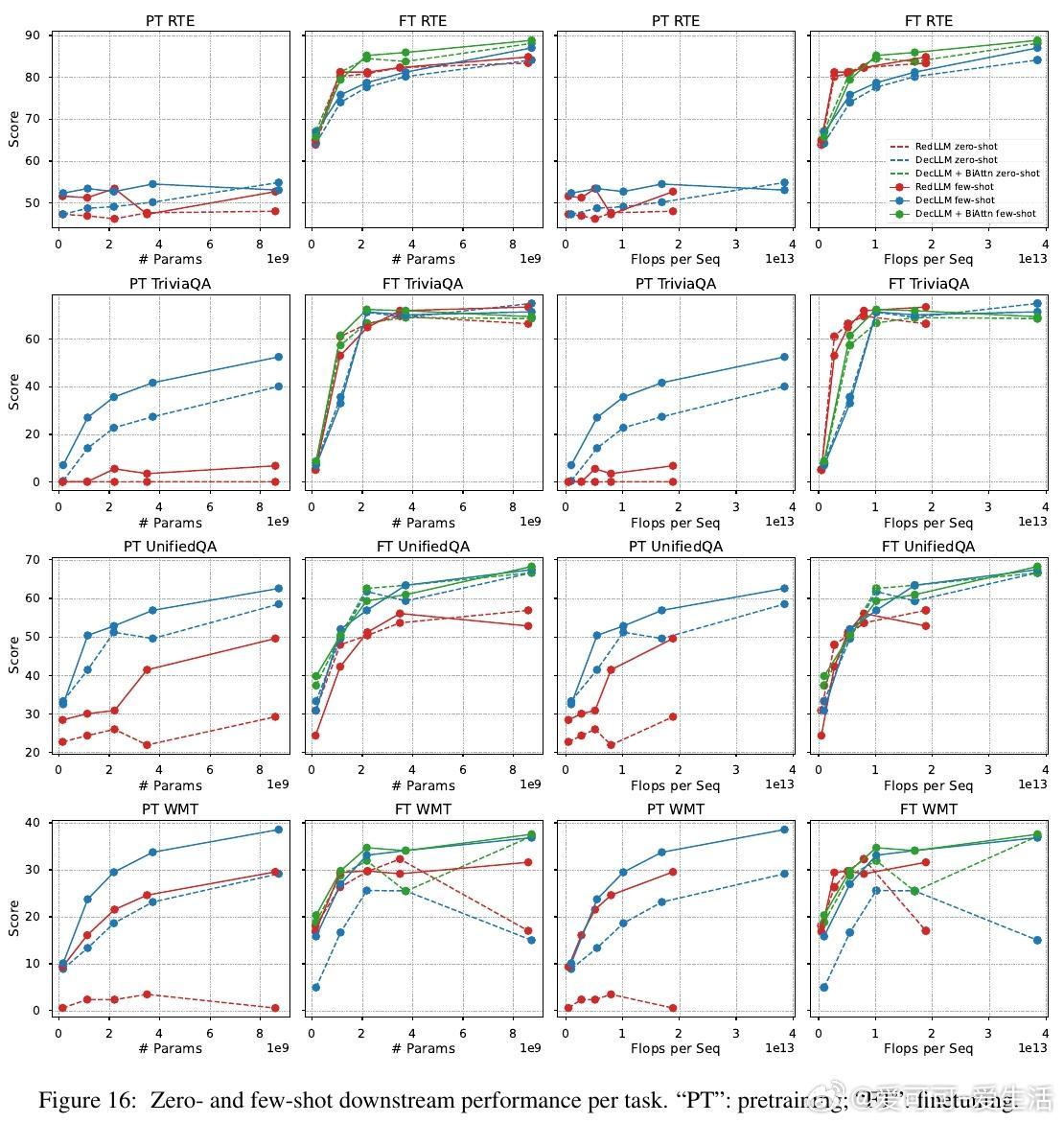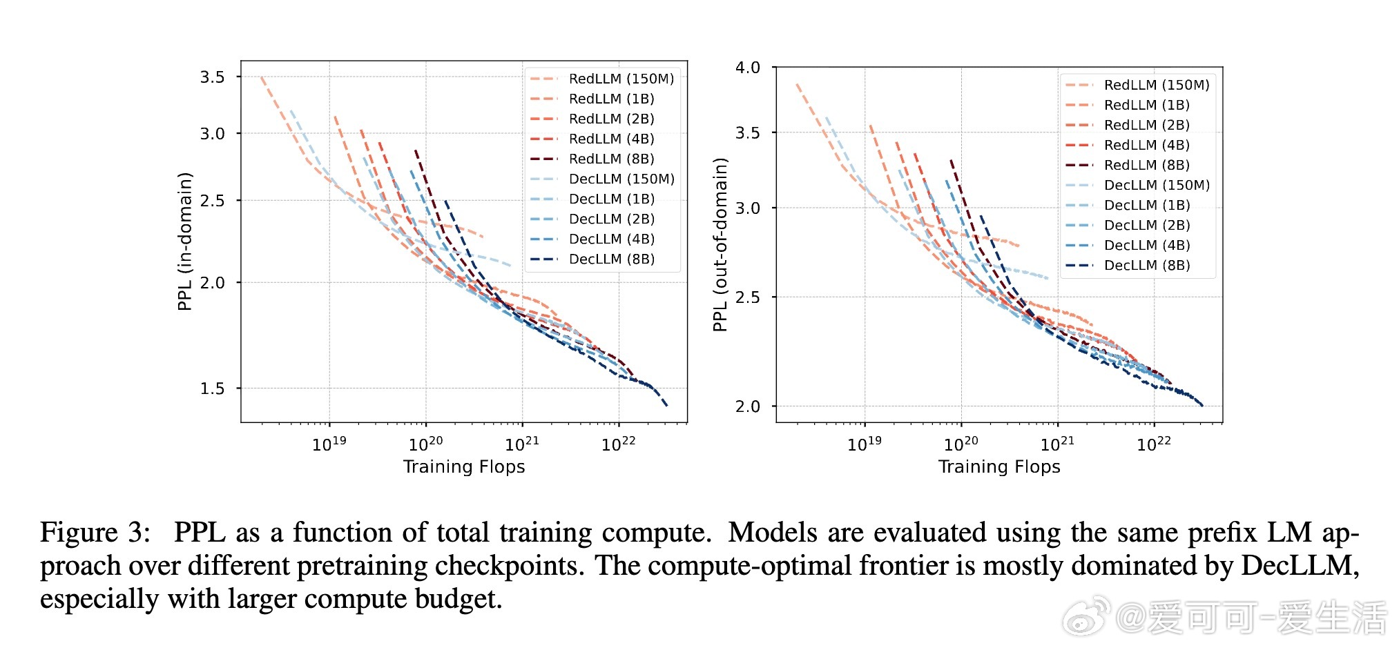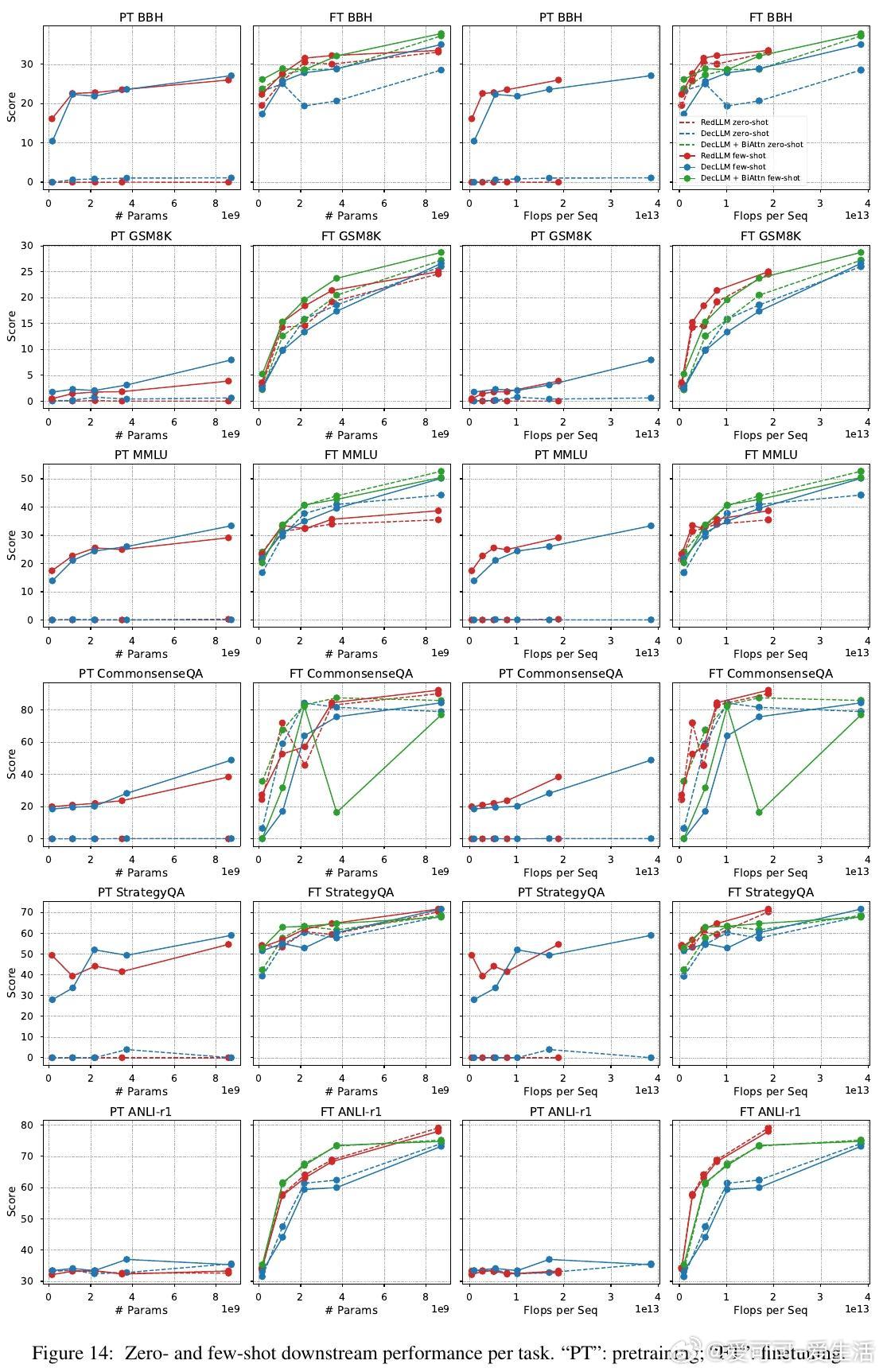 1. 预训练阶段,RedLLM与DecLLM在模型规模与计算量扩展上的表现相似,但DecLLM在计算效率上更优,尤其在零样本(zero-shot)和少样本(few-shot)学习上远超RedLLM。